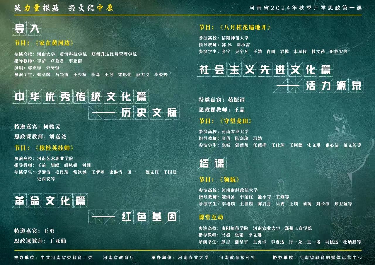 为深入学习宣传贯彻习近平新时代中国特色社会主义思想,贯彻党的二十大和二十届三中全会精神,引导师生深刻把握新时代伟大成就,增强忠诚捍卫“两个确立”、坚决践行“两个维护”的思想自觉和行动自觉,展示好、宣传好暑期大思政实践活动成果,9月14日19:00,省委教育工委、省教育厅举行“筑力量根基 兴文化中原”河南省2024年秋季开学思政第一课。本次思政大课在“河南省教育厅”、“豫教思语”视频号等平台播出,点赞量超6000万,共吸引246.1万师生齐聚“云端”。