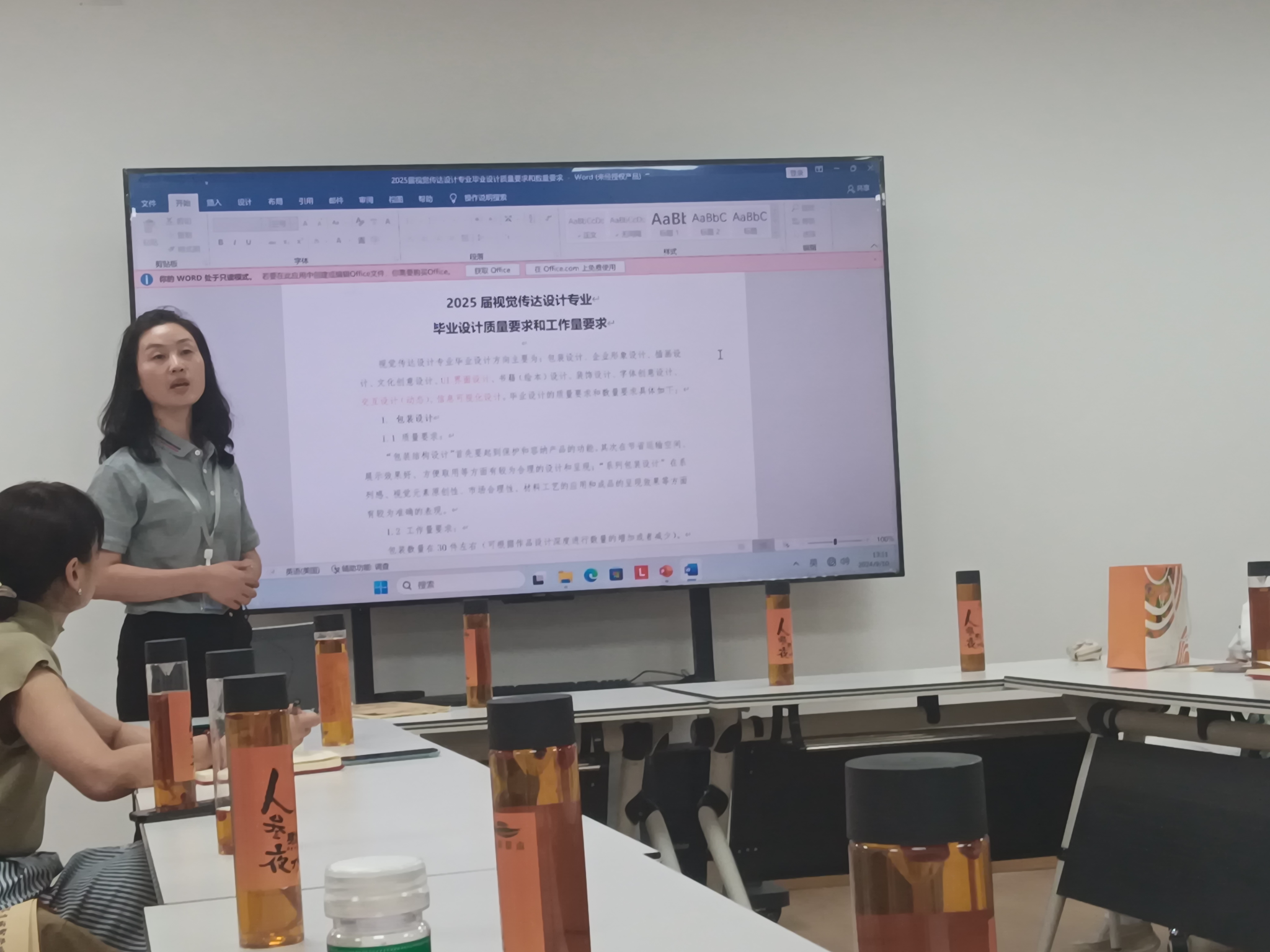 首先,郭主任对2024届毕业生的毕业设计(论文)情况进行了全面总结。她指出“尽管部分员工在设计理念和表现手法上展现出较高水平,但在创新性、应用性和学术深度等方面仍存在不足之处。”为此,教研室决定在2025届视传专业毕业生的教学和指导工作中进行改进,尤其是针对毕业设计的选题质量提出了更高要求,力求通过优化选题来提升整体作品水平。