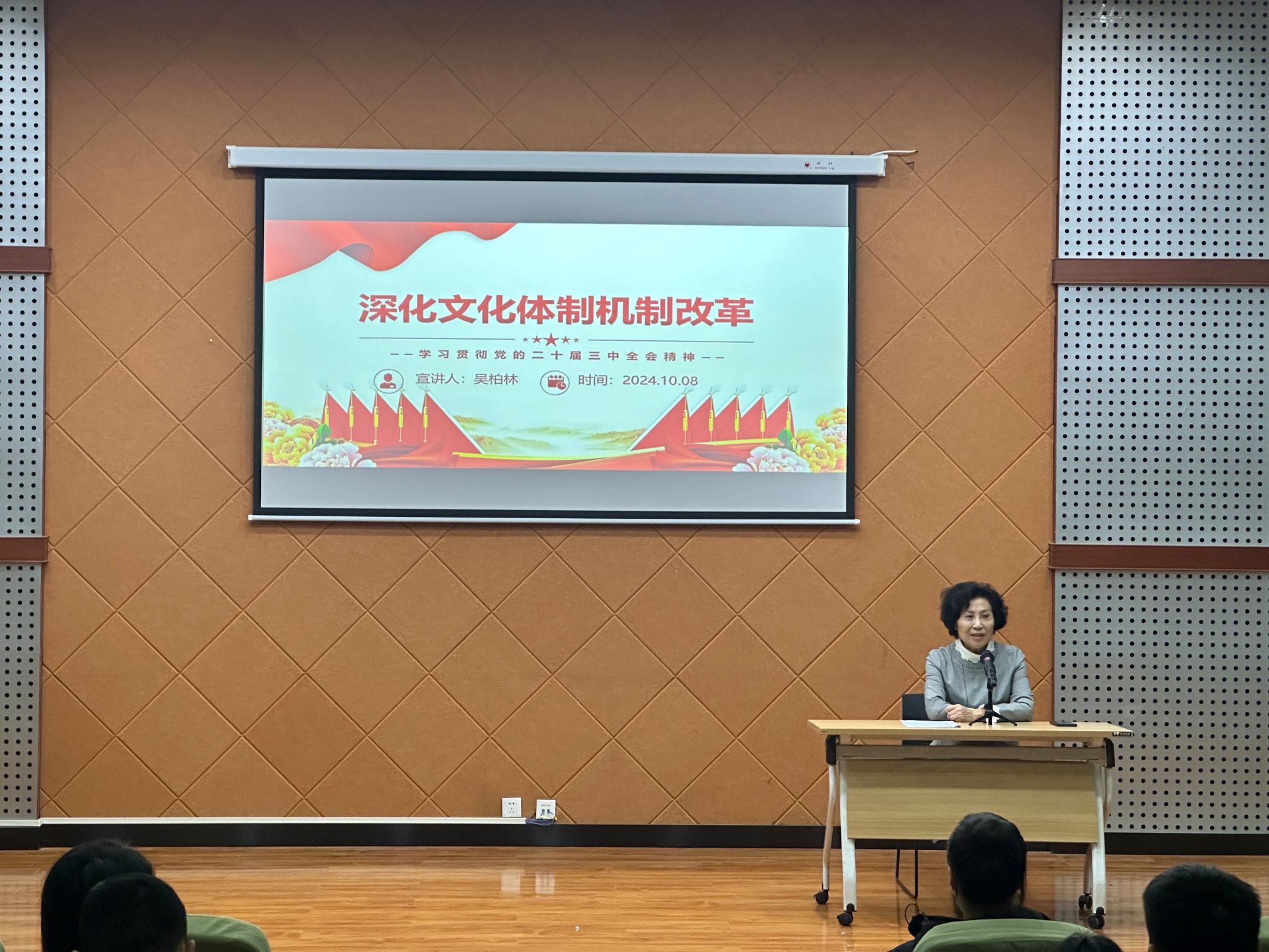 吴柏林经理以《深化文化体制机制改革-学习党的二十届三中全会精神》为题授课,从充分认识深化文化体制机制改革的重大意义、牢牢把握深化文化体制机制改革的基本要求、牢牢把握深化文化体制机制改革的基本要求等三个方面进行了讲授。吴经理指出,文化关乎国本、国运,文化兴则国运兴,文化强则民族强。党的二十届三中全会通过的《中共中央关于进一步全面深化改革、推进中国式现代化的决定》,立足强国建设、民族复兴的战略高度,着眼赓续中华文脉、推动文化繁荣的重大使命,聚焦建设社会主义文化强国,提出深化文化体制机制改革重大任务,明确改革路径和具体举措,为新时代新征程文化改革发展提供了根本遵循、指明了前进方向。深化文化体制机制改革,是担负新的文化使命的必然要求,是丰富人民精神文化生活的内在要求,是提升国家文化软实力和中华文化影响力的时代要求。文化生产是创造性劳动,核心在人,人才济济、人物辈出,文化才能繁荣兴盛。文化人才的出现有其自身规律和特点,要通过改革营造有利于人才创新创造的文化生态,真正把人才凝聚到党的宣传思想文化事业中来。吴经理强调,要用好中华文化资源、紧扣国际关切讲好新时代中国故事,展现可信、可爱、可敬的中国形象。