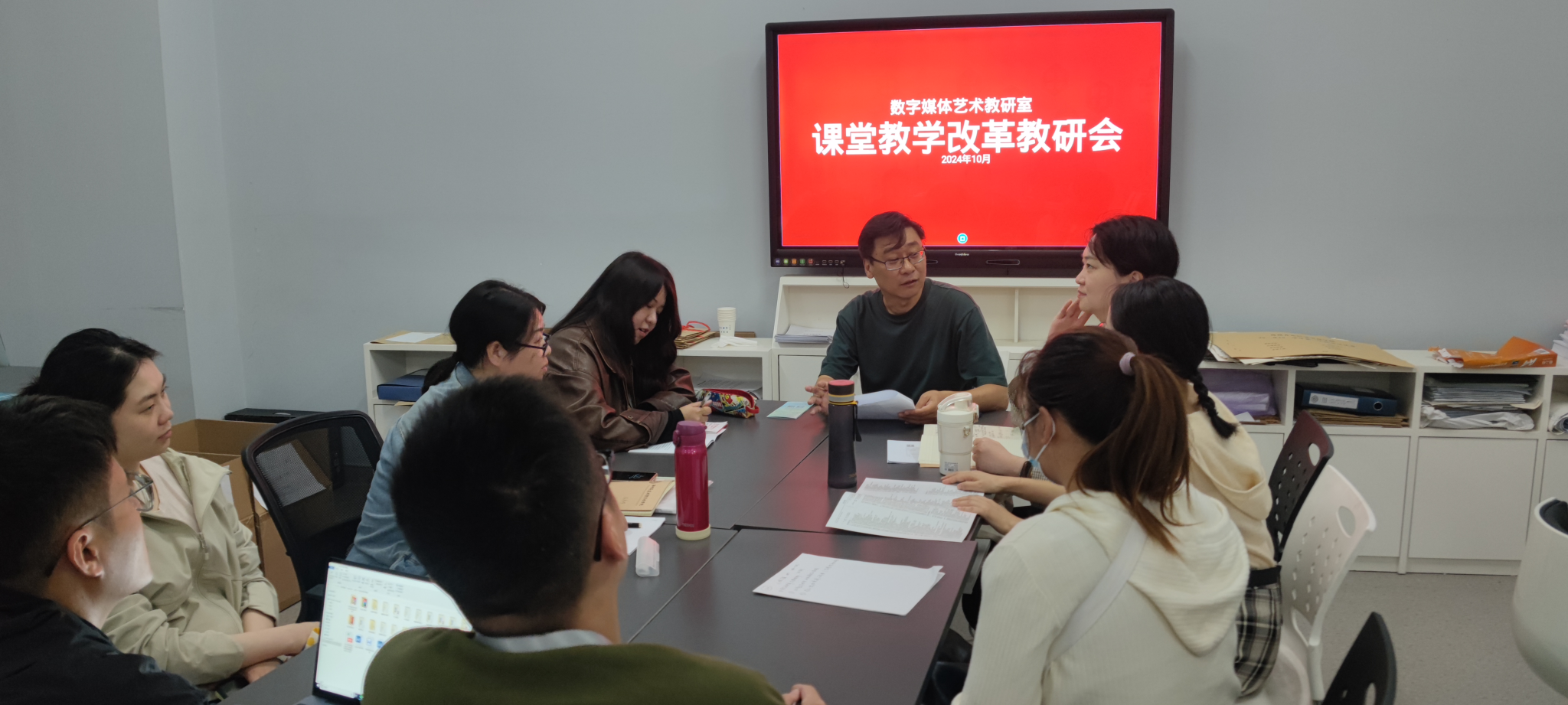 2024年10月8日下午,数字媒体艺术教研室在艺术楼204举行了以“课程思政”为主题的教学改革研讨会。会议围绕如何在专业课程中融入思政元素进行了深入探讨。会议由教研室主任杨世英主持,全体教研室成员参与。