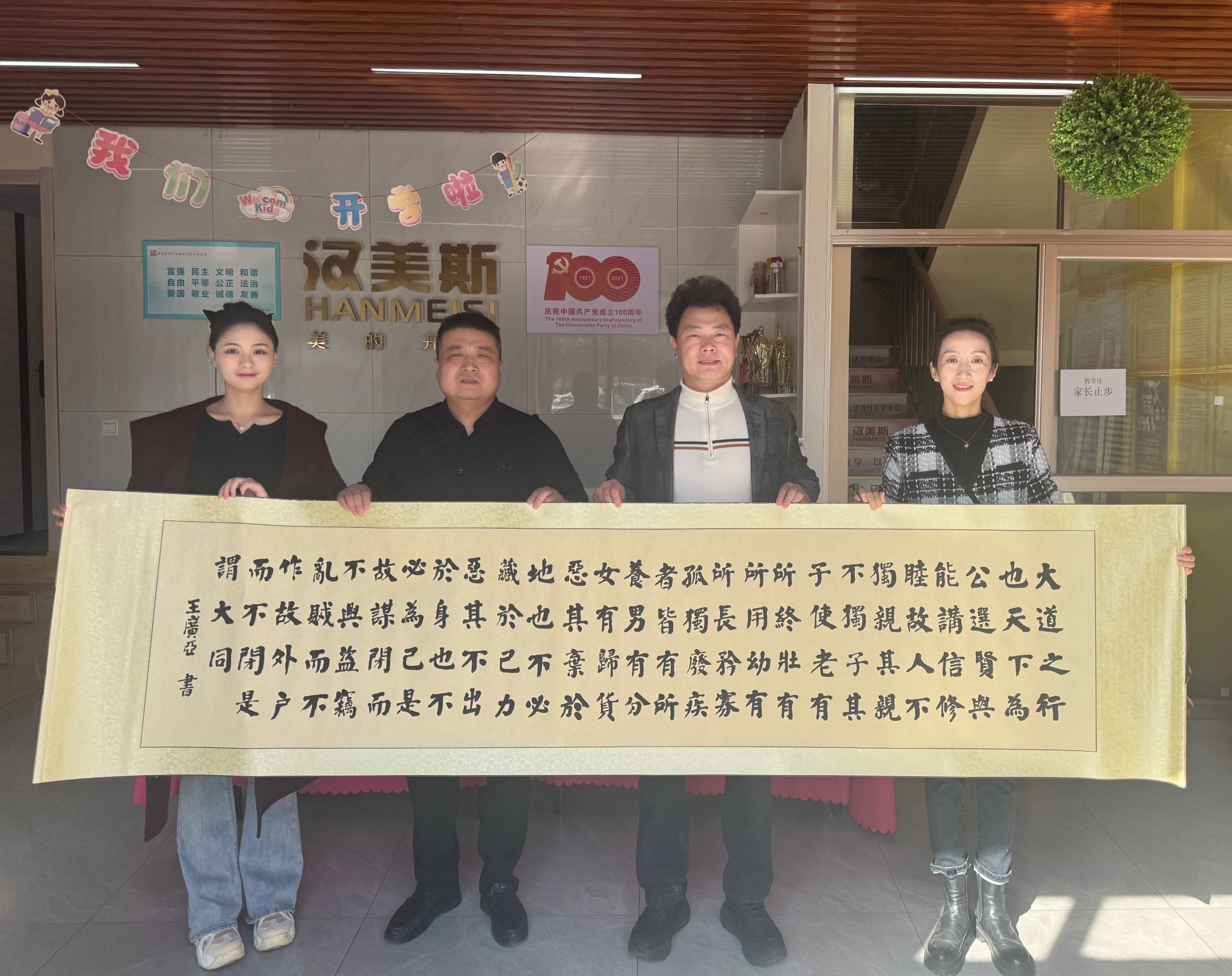 在活动的最后环节,池浩东副经理代表公司向新郑市汉美斯晟艺术培训中心有限公司赠送了公司创办人王广亚先生的书法作品及书籍。这一举措不仅表达了公司对合作企业的诚挚感谢,也传递了公司深厚的文化底蕴和人文关怀。
