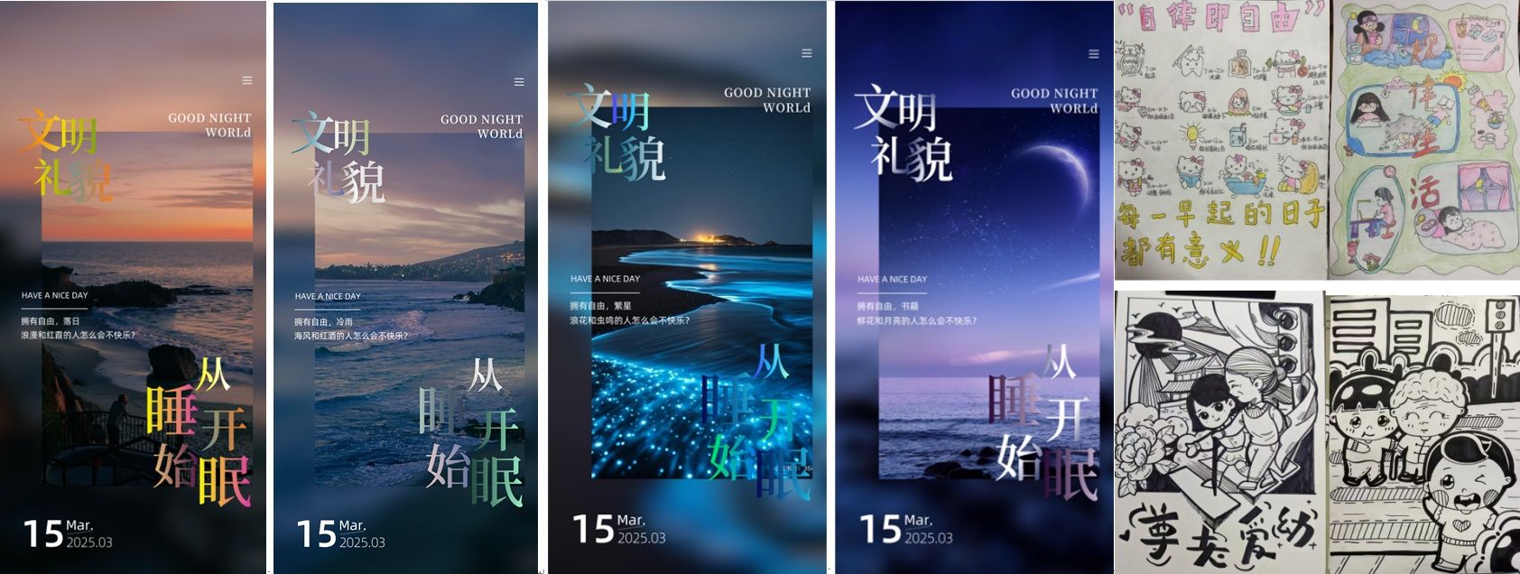 海报设计活动与专题手绘和漫画活动。艺术学子们将创意与教育意义完美融合,在海报设计以及手绘、漫画创作中大放异彩。这些海报色彩鲜艳、构图巧妙,以醒目的文字和形象的画面,直观地向师生们传递着健康睡眠的重要信息,如 “告别熬夜,拥抱晨曦”“充足睡眠,点亮生活” 等标语搭配上员工们精心绘制的熟睡面庞、初升的太阳等元素,极具视觉冲击力。而专题手绘和漫画作品,则更加细腻地展现了睡眠与文明礼貌之间千丝万缕的联系,以连载漫画的形式讲述主人公因改善睡眠习惯,从课堂上的昏昏欲睡到积极参与校园活动、与同学友好相处的蜕变故事,让同学们在欣赏艺术作品的同时,潜移默化地接受文明礼貌教育。