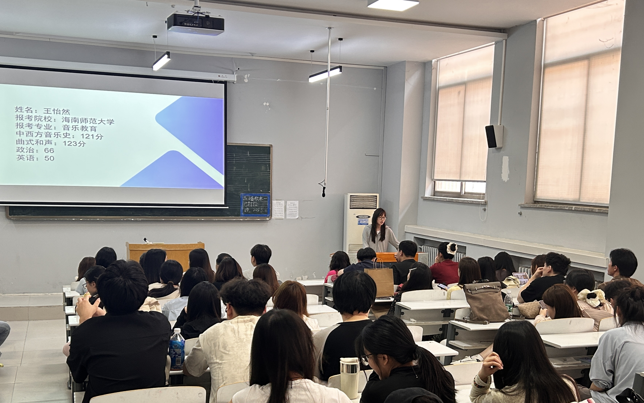 交流会伊始,三位优秀考研学子依次分享宝贵经验。2021级音乐表演本科1班孙韵璇,考取贵州大学音乐教育专业研究生。他分享了自己的学习心得与备考心态,引发在场同学共鸣。2021级音乐表演本科2班原琳婧,考取扬州大学音乐专业研究生。她系统讲解备考规划与复试流程,互动环节耐心答疑。2021级音乐表演本科2班王怡然,考取海南师范大学音乐教育专业研究生。她着重分享时间规划与复习技巧,强调有效学习的重要性,希望能为学弟学妹们提供帮助。