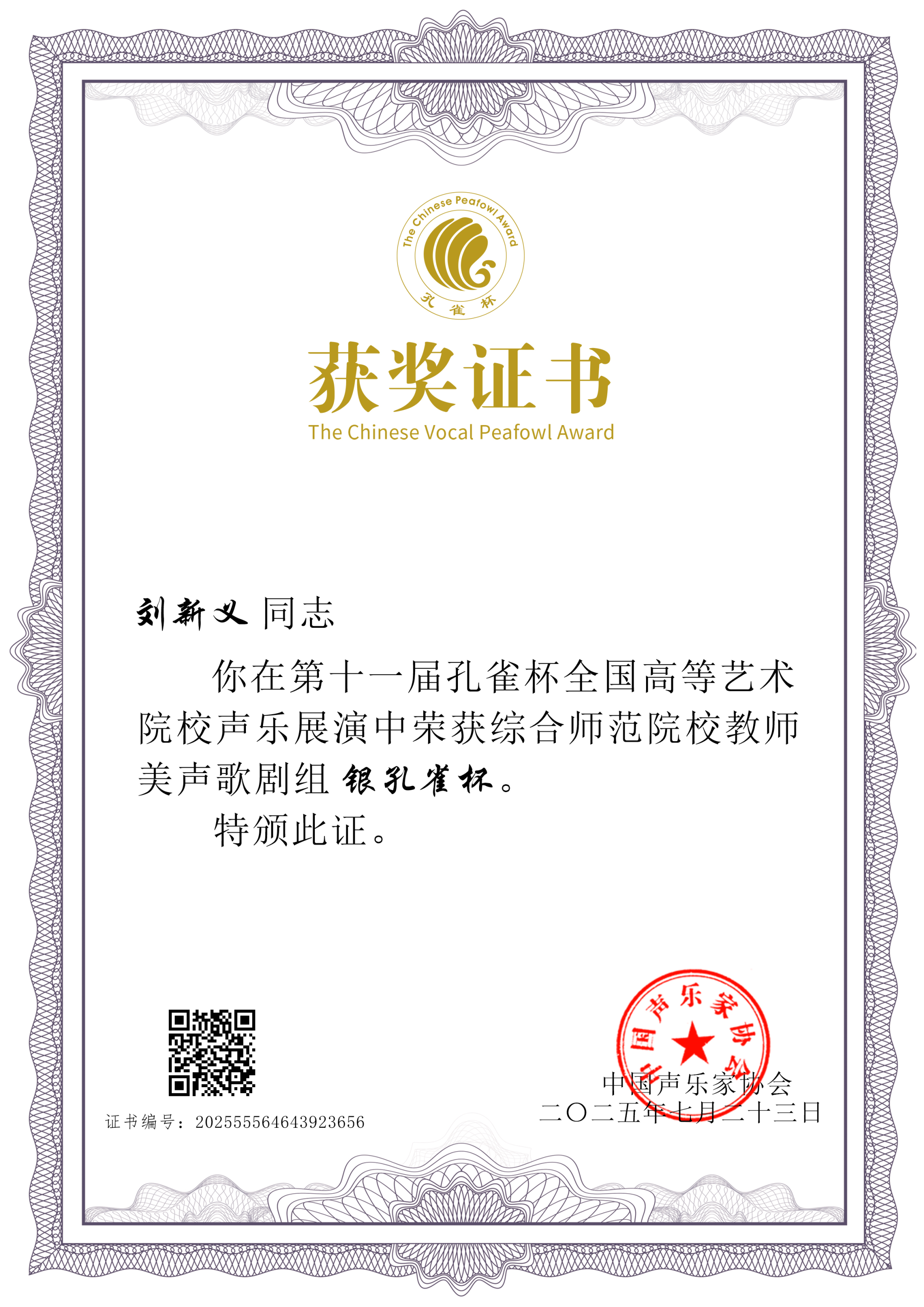 2025年7月16日至23日,第十一届“孔雀杯”高等艺术院校声乐展演在广州市星海音乐公司成功举办。公司yL23411永利集团官网教师刘新义老师凭借精湛技艺,荣获综合师范院校教师美声歌剧组“银孔雀杯”,充分彰显了公司教师卓越的艺术造诣与舞台风采。刘新义副教授是河南省首位假声男高音,波兰克拉科夫音乐公司的音乐艺术博士,也是此次综合师范院校教师美声歌剧组100位选手中的唯一一位假声男高音。
