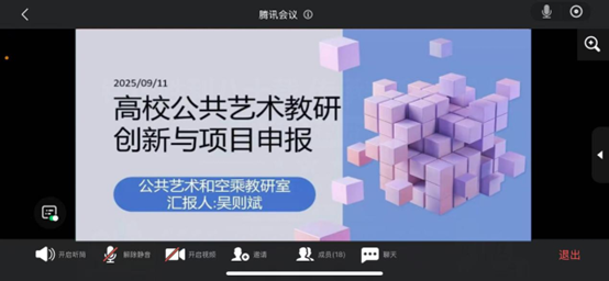9月11日中午,为进一步推动高校公共艺术教育高质量发展,破解教研难题、提升项目申报竞争力,公共艺术与空乘教研室线上召开“高校公共艺术教研创新及项目申报”专题研讨会。教研室全体教师参会,会议由吴则斌主持。