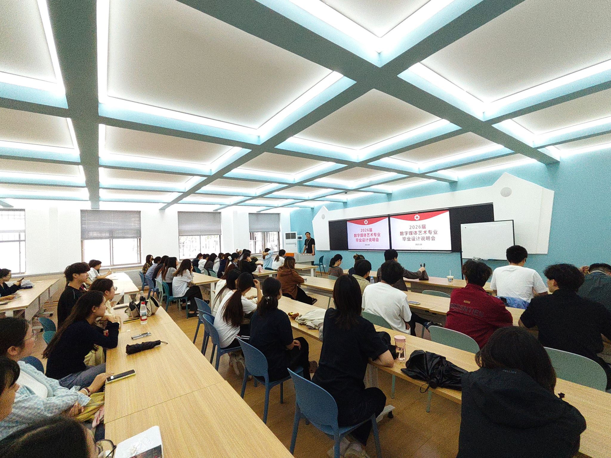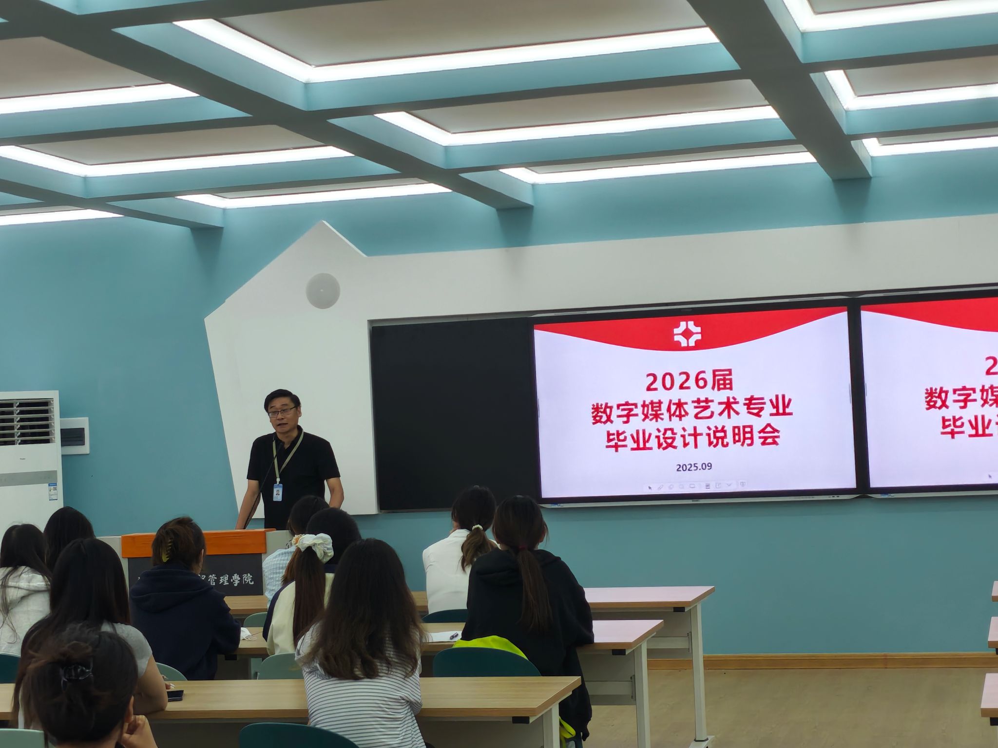 2025年9月12日,数字媒体艺术教研室于商管楼106教室组织召开2026届毕业设计说明会。会议由教研室主任杨世英主持,数字媒体艺术专业全体教师及2022级本科生共同参与。本次会议旨在系统介绍毕业设计流程、明确时间节点与成果要求,并推动师生进行双向选择,为毕业设计工作的顺利开展奠定基础。