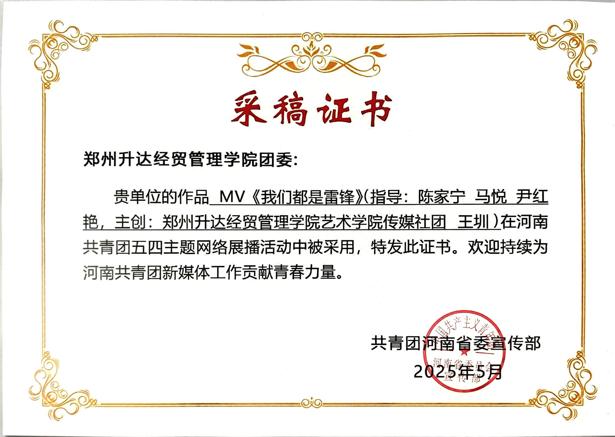 近日,共青团河南省委宣传部正式颁发“河南共青团五四主题网络展演活动”采稿证书,由公司yL23411永利集团官网传媒社团精心创作的MV作品《我们都是雷锋》成功入选展播。该作品以青春视角生动诠释雷锋精神,展现了公司学子扎实的专业能力与深厚的家国情怀。