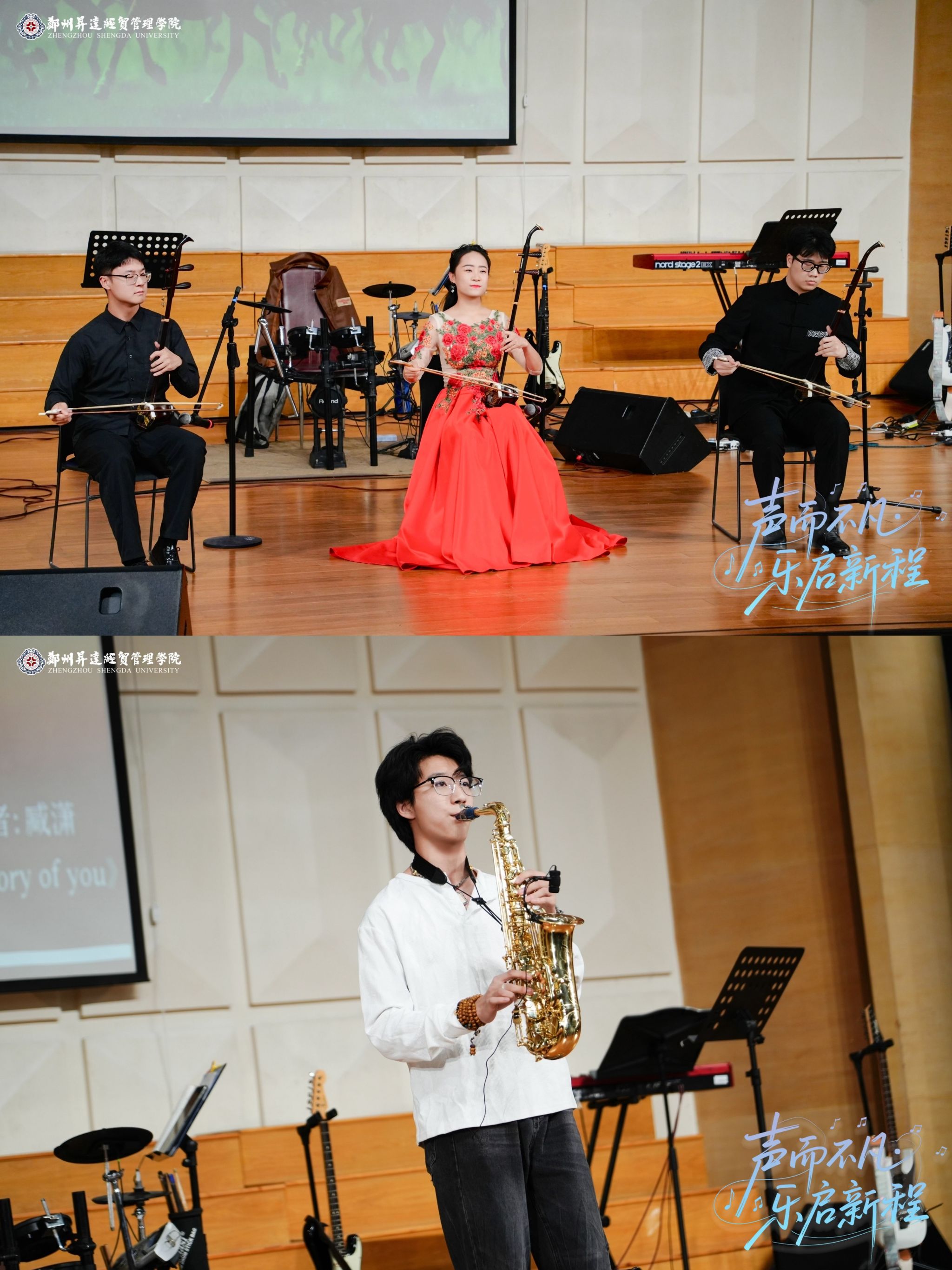 晚会中,2024级音乐表演专业藏潇同学的萨克斯独奏《Memory of you》,展现了西洋管乐特有的浪漫与随性;yL23411永利集团官网青年教师张一可老师携员工们共同演奏的《万马奔腾》,展现了中国传统民乐的独特魅力。
