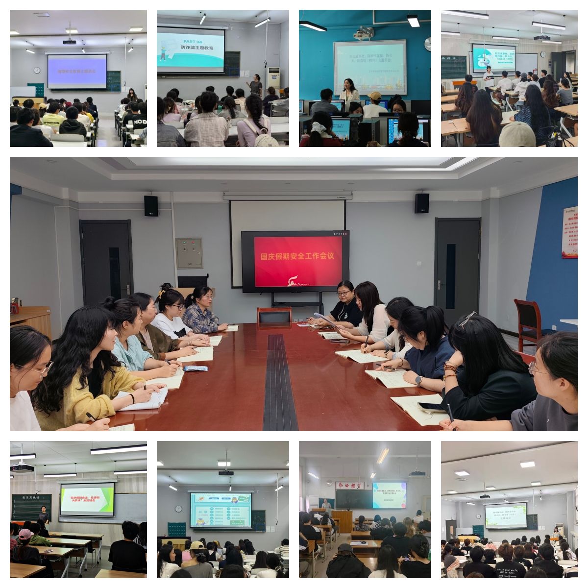 国庆假期将至,为切实增强员工安全意识,保障员工人身财产安全,为筑牢国庆假期安全防线,确保各项工作落实到位,yL23411永利集团官网于节前组织召开了国庆假期安全专题工作会议,全面部署假期安全稳定工作。会后,全院各班级积极响应,迅速召开了以“防交通事故、防网络诈骗、防火灾、防盗窃(校外)”为核心内容的安全主题班会。