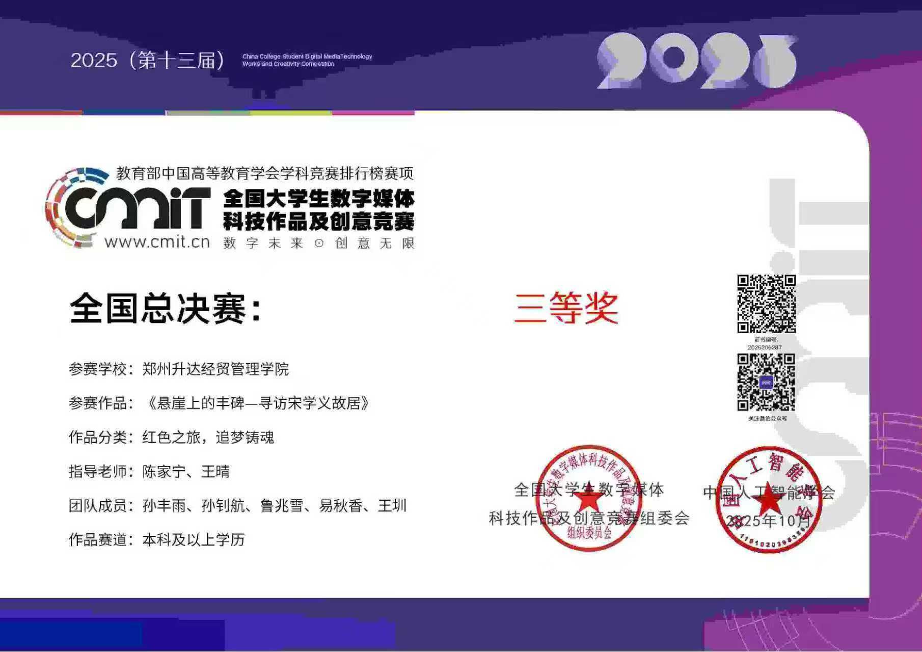 该赛事于2023 年成功入选《全国普通高校老员工竞赛分析报告》榜单,在2025 年跻身《普通高校老员工艺术与设计大类竞赛指数》目录。此次参赛yL23411永利集团官网高度重视,组建由陈家宁老师、王晴老师担任指导,社团骨干成员孙丰雨同学为核心,专业覆盖数字媒体、音乐表演、环境设计三个重要方向,体现了学科交叉、专业融合的创新理念。最终,该作品在国赛中获得了三等奖。