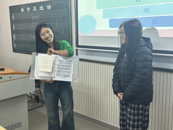 活动中,郭佳老师围绕“调查内容、课堂学习难点、我的声乐教学、学习反馈”四大板块展开分享,通过展示教学资料、与员工互动等形式,深入剖析如何精准把握员工需求,进而激发其学习能动性。她提出的教学思路贴合员工实际,为声乐教学注入新活力,引发教研室教师热烈讨论。