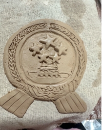 实操环节,团员们分组协作,将专业技能与家国元素深度融合。一组团员专攻国徽陶艺造型,他们参照国徽的金红配色规范,用浮雕手法还原五星照耀下的天安门,又以细腻线条勾勒谷穗与齿轮,同时巧用视觉传达的对称构图理念,让整个国徽陶盘既符合规范又具艺术张力。另一组聚焦士兵陶艺造型,灵感源自救灾中子弟兵的感人场景,团员们提炼出士兵坚毅站立、通过夸张的肌肉肌理和紧凑的肢体线条,凸显军人的责任与担当,还在底座刻上“守护”二字强化主题。此外,还有小组创新组合元素,将士兵造型与国徽局部纹样搭配,创作出台灯底座,寓意“以守护之光映照家国蓝图”。