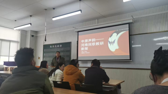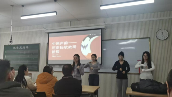 为推动本土艺术资源与教学实践深度融合,12月18日中午,声乐合唱教研室柴占红老师主持的“中原声韵——河南民歌教研新探”主题教研活动在公司多媒体教室成功举办,教研室专业教师参与研讨交流。