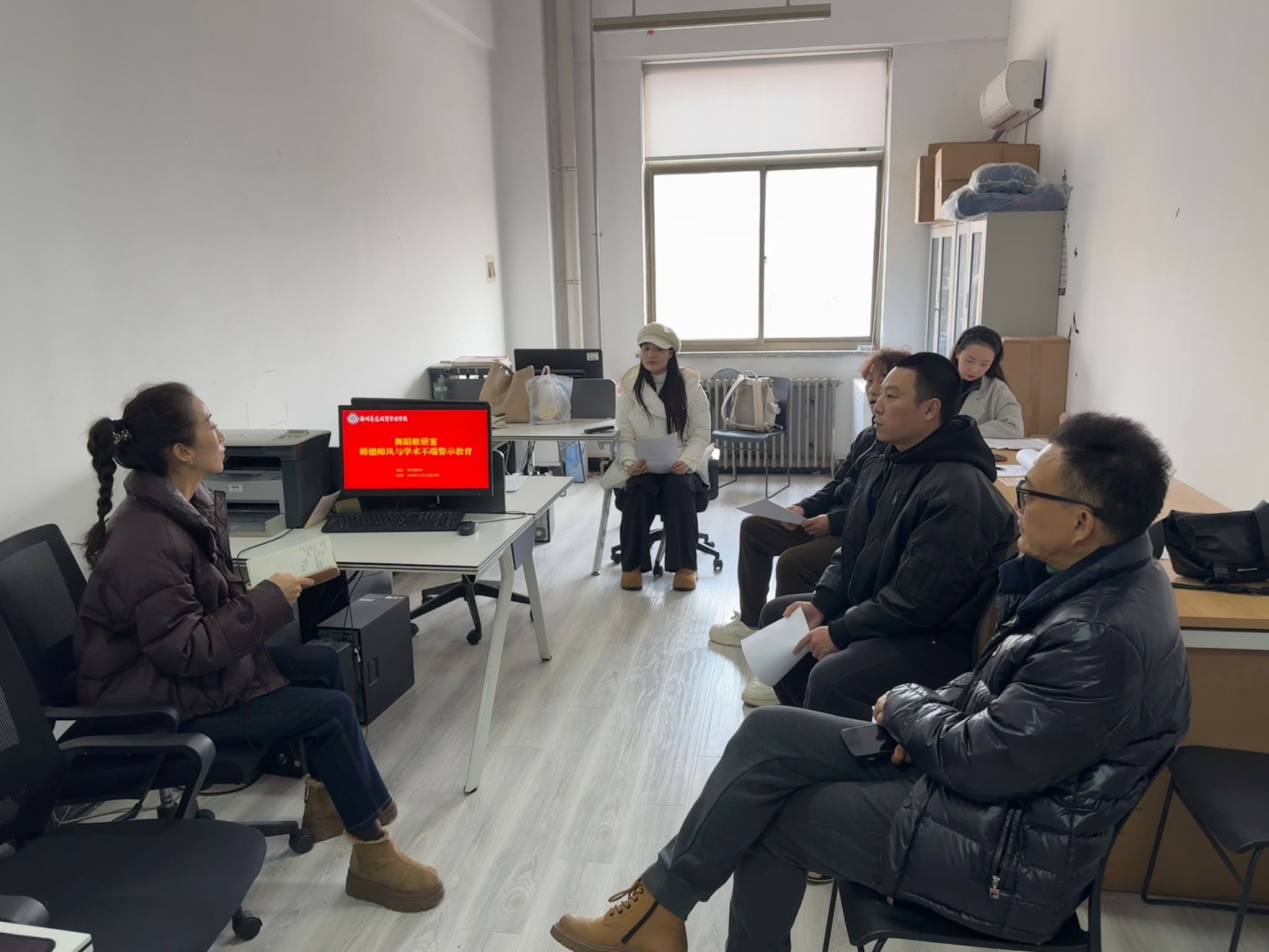 12月18日,舞蹈教研室于艺术楼409办公室召开专题学习会,深入学习宣传习近平总书记关于师德师风建设与科研作风学风治理的讲话精神,会议由教研室主任段婷婷主持,全体教师参与。