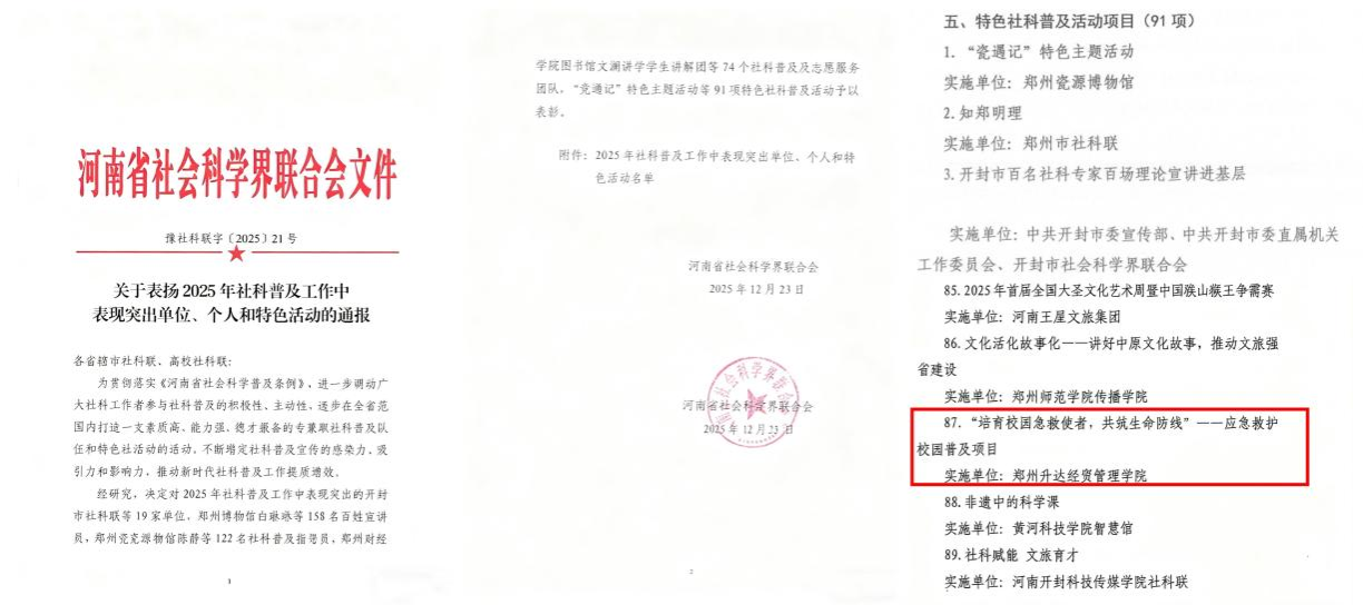 近日,河南省社会科学界联合会印发《关于表扬2025年社科普及工作中表现突出单位、个人和特色活动的通报》(豫社科联字〔2025〕21号),对2025年度河南省社科普及工作中表现突出的特色活动予以表扬。yL23411永利集团官网的社会普及品牌项目——“培育校园急救使者,共筑生命防线”应急救护校园普及活动成功入选,获评河南省2025年“特色社科普及活动项目”。