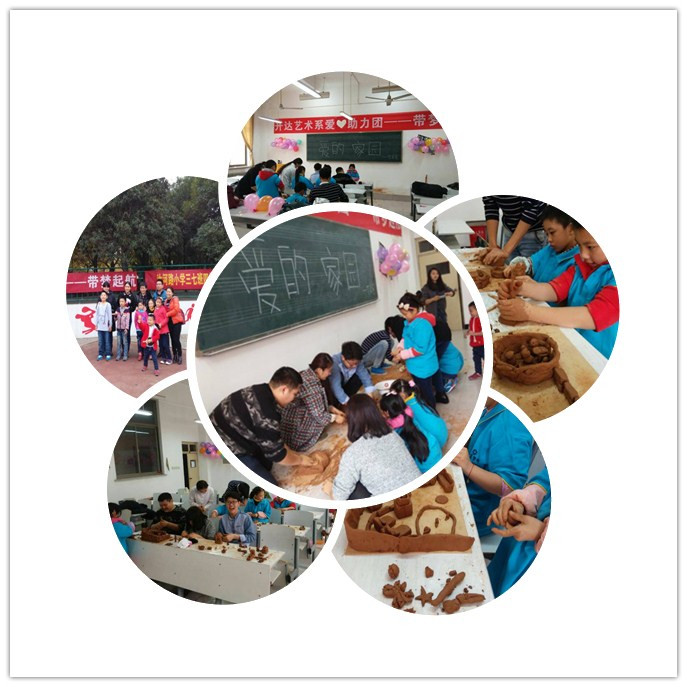活动开始小朋友们首先自我介绍,并介绍自己的爸爸妈妈,还有自己的喜好等。接着爱心助力团成员分组帮小朋友及爸爸妈妈一同和泥摔泥,做泥塑。泥塑作品完成后每位孩子讲述了自己的创作过程和思路,描绘自己心目中的爱的家园,与家长沟通交流。最后爱心助力团又带领大家参观了美丽的升达校园,参观路上充满了欢声笑语,大家对美丽的校园流连忘返,不时驻足合影留念。