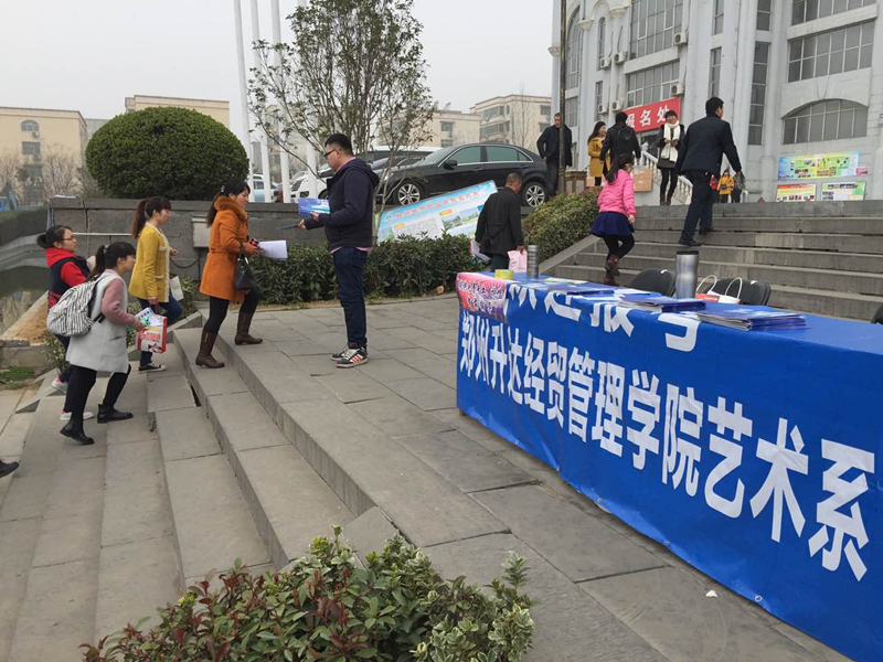 阳春三月,万物复苏,柳绿花红,莺歌燕舞,大地一片生机勃勃。3月8日上午我系按照公司今年艺术类招生宣传要求,以李育兵老师为招生总负责人的前期8名师生到登封进行招生宣传。到达登封鹿鸣山庄学术交流中心以后,我们的师生马上就投入工作中,悬挂条幅,摆放宣传摊位和展板,以及发放精美的宣传资料。
