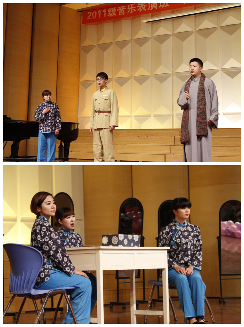 民族歌剧《白毛女》则把同学们的表演技艺展现到了极致:杨白劳的无助、喜儿的乖巧伶俐、穆仁智的凶神恶煞被同学们演绎的栩栩如生,让我们看到了旧社会人民大众的艰辛劳苦与地主恶霸的冷酷无情,不免让人唏嘘。