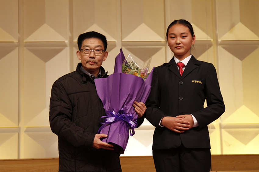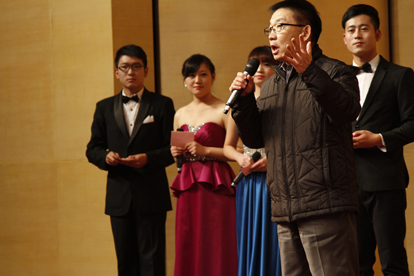 晚会伊始,经理崔慕岳教授作了即兴致辞,他首先肯定了艺术系师生在教学改革上作出的有益尝试,之后崔经理用“缺少艺术教育的高校是残缺的,是苍白的,是不完整的!”高度评价了艺术教育对大学文化环境构建的重要作用,接着他借用19世纪德国诗人海涅作词、门德尔松谱曲的《乘着歌声的翅膀》,祝全体毕业生都能乘着歌声的翅膀,飞向美好的未来。最后,崔经理用一句“无论同学们走到哪里,我希望都如今夜——青春,永不散场!”结束了他激情热烈的发言。在场的师生都被崔经理精彩的讲话深深地打动,音乐厅响起了经久不息的掌声,同学们纷纷上台献花,崔慕岳经理也与同学们亲切合影留念。