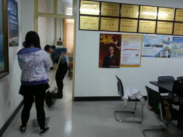 在班委的组织和带领下,同学们各就其职,开始了热火朝天的打扫,整个办公室到处都有同学们勤劳无私奉献的身影。