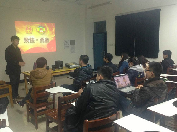 看“两会”报道,学“两会”知识,为提高同学们的政治素养,结合“两会”相关报道,艺术系2012级团总支于3月5日在新综合楼609教室,开展了“两会知多少”学习活动。2012级辅导员姚立老师参加了此次活动。