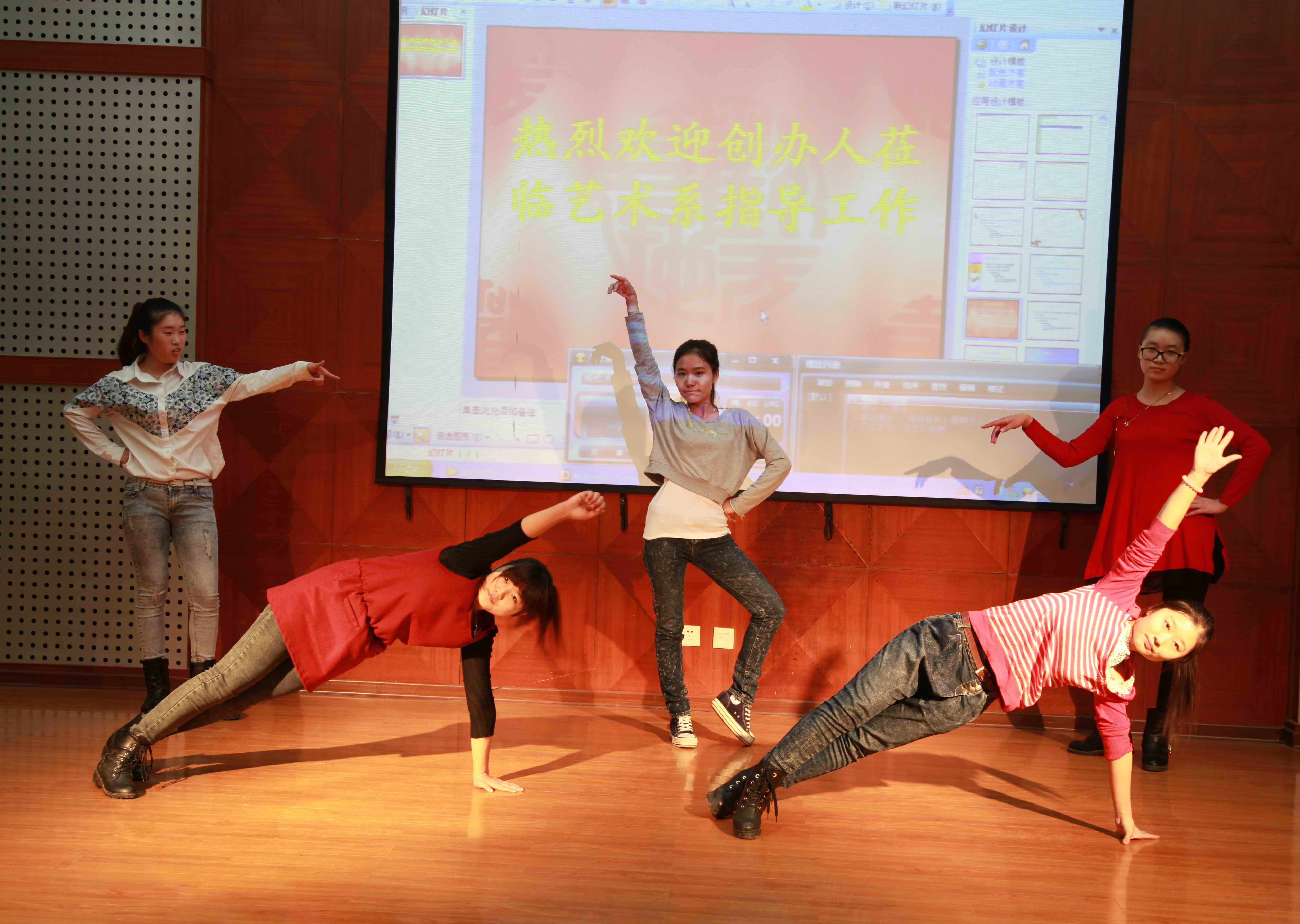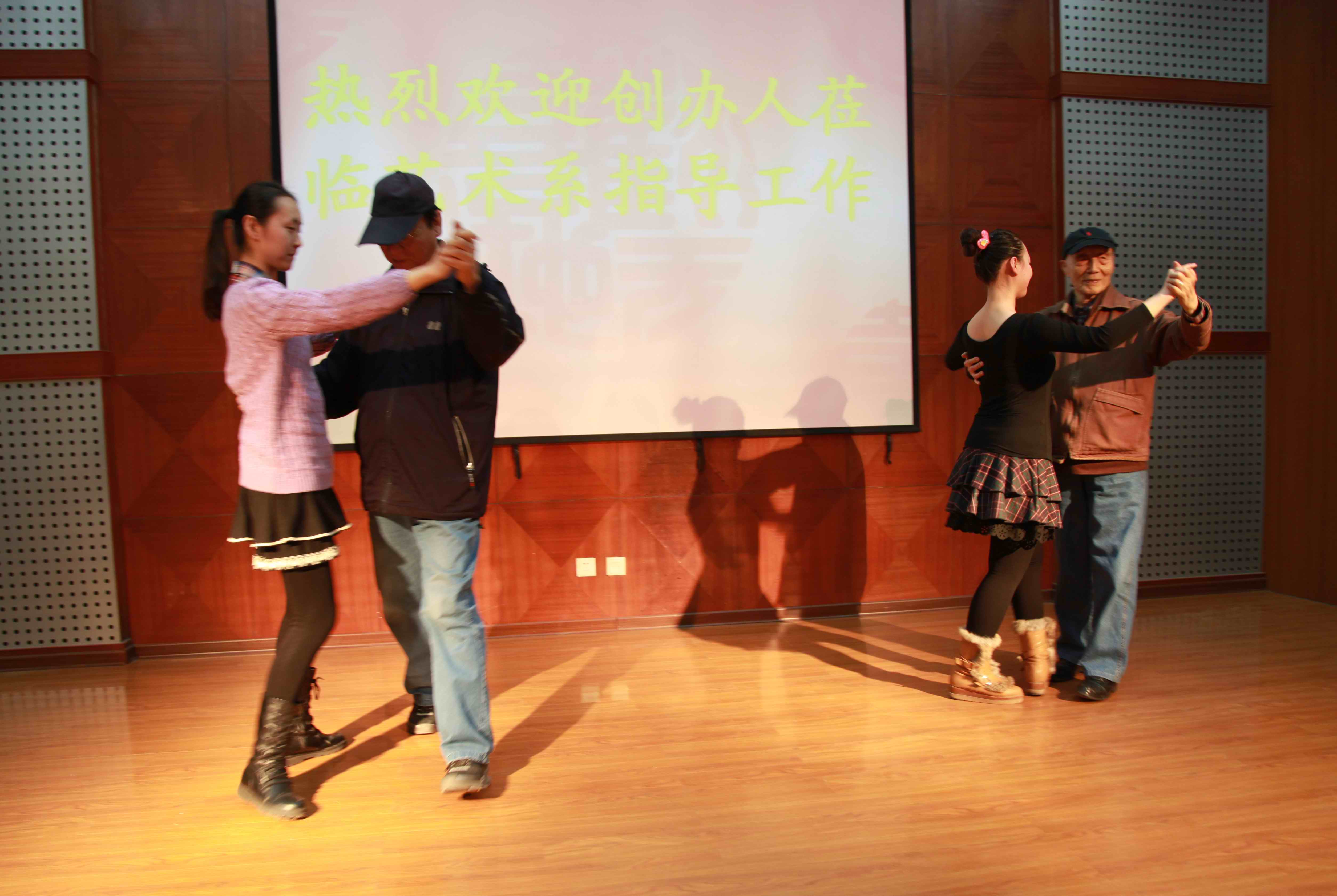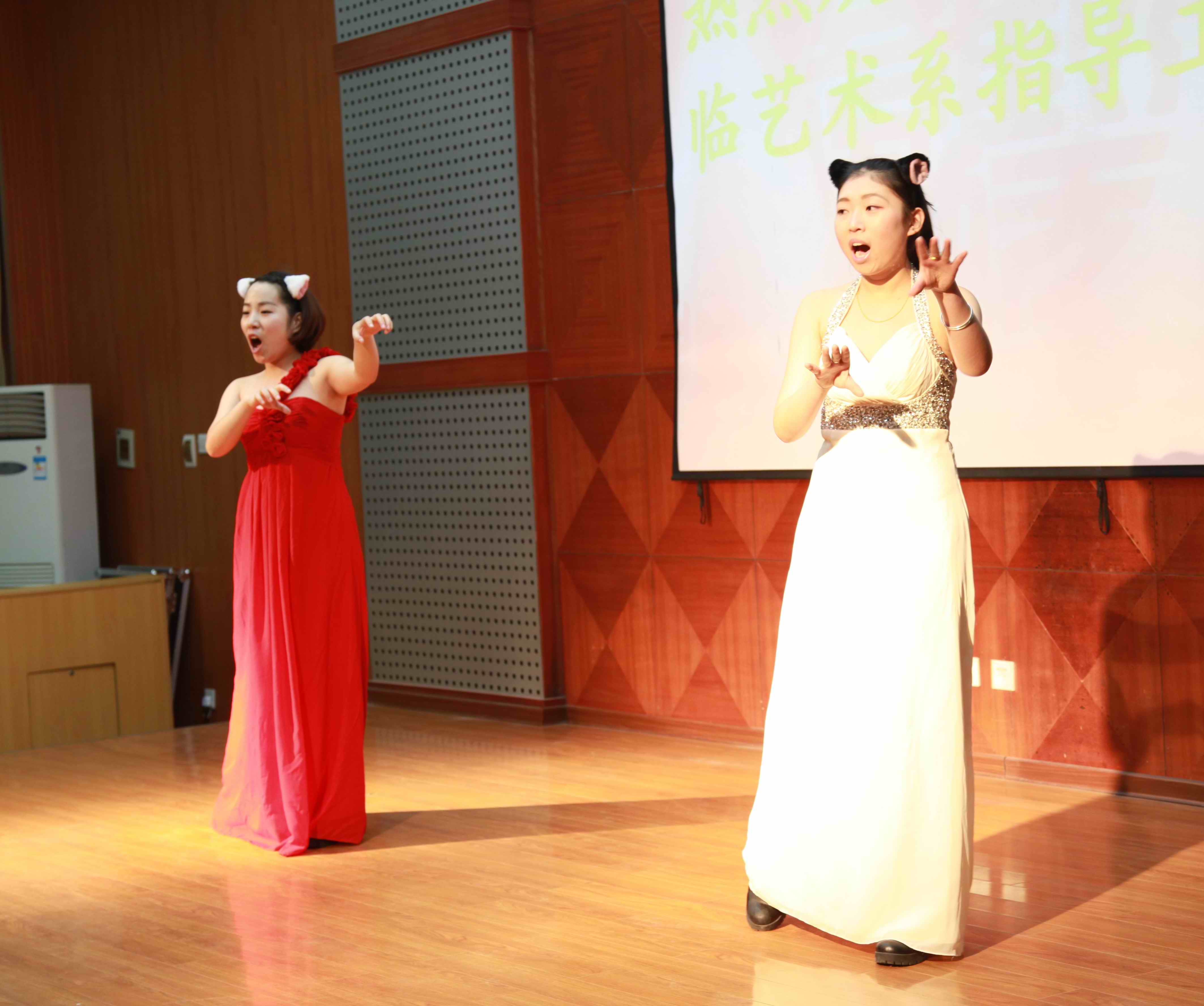 随后,艺术系临时抽调了五个实践教学内容:1、歌曲独唱:《长鼓敲起来》、演唱:12级音表:邹璐,指导老师:安冉;2、二胡合奏《赛马》、演奏:10级音表:张瑜、田鹏,指导老师:何钊哲;3、二重唱:《猫之二重唱》;演唱:12级音表:方婉颖、李珊珊,指导老师:安冉;4、舞蹈:12级音表:魏淑丽,周晓函等,指导老师:张森;5、通俗独唱:《我爱不爱我》,12级音表王磊,指导老师:何红卫。成功的进行了汇报实践教学汇报,随后创办人在现场师生的热情感染下接受员工的邀请翩翩起舞。