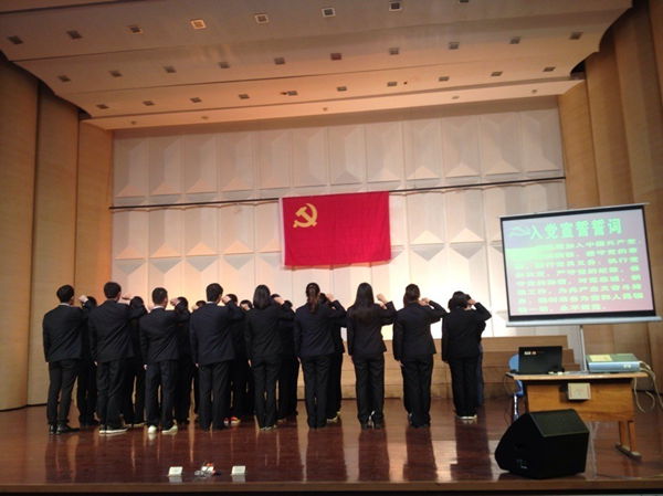 伴随着雄伟的《国际歌》,宣誓仪式正式开始。艺术系员工第一党支部书记赵会燕同志宣读了参加宣誓仪式的新党员名单,并在她的带领下新党员举起右拳,面向鲜艳的党旗进行了庄严的宣誓。