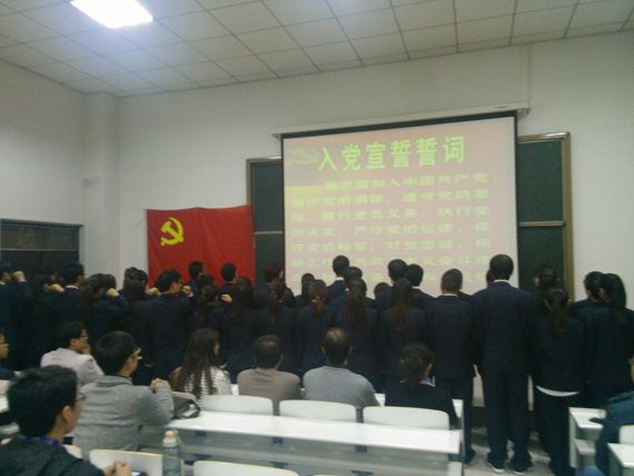 伴随着雄伟的《国际歌》,宣誓仪式正式开始。文法系党总支宣传委员郑玲玲同志宣读了参加宣誓仪式的新党员名单,两系共50名新党员在艺术系第三党支部书记豆永丽同志的带领下举起右拳,面向鲜艳的党旗进行了庄严的宣誓。