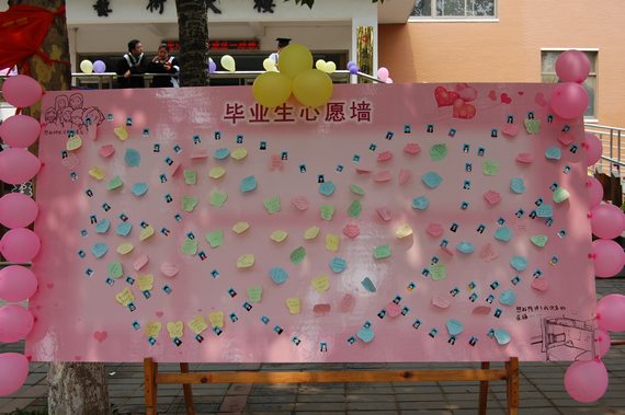 毕业生们纷纷写下自己的心愿贴在墙上。心愿墙上即将贴满他们的心愿贴,而每一张心愿贴上都承载着一个美好的愿望。