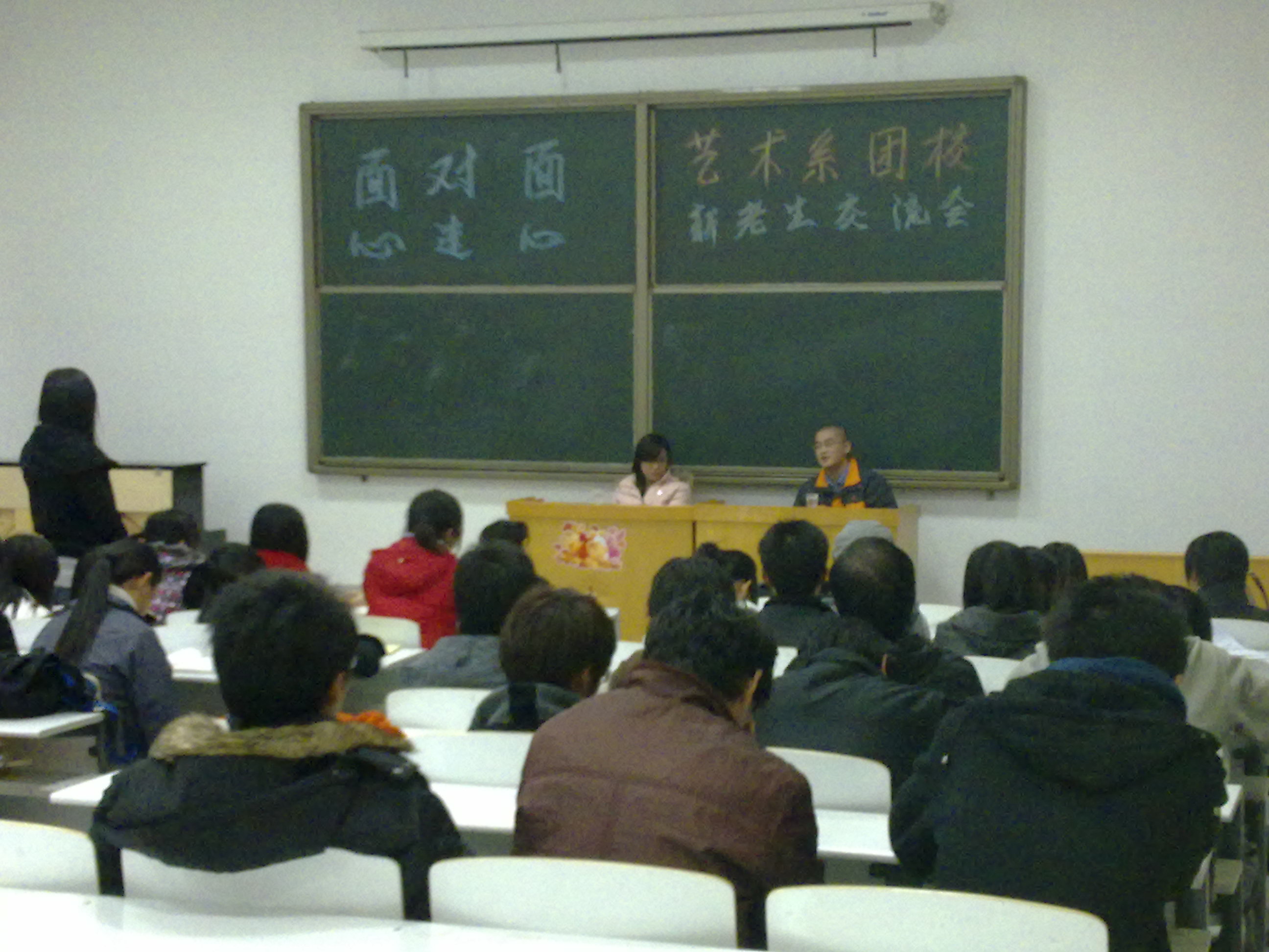 2009年11月24日晚7点在艺术楼104举办了以“面对面,心连心”为主题的团校新老生交流会,艺术系朱影影老师、潘悦老师、院团学会组织部副部长李泽、会计系团委副书记焦雨薇出席了活动。