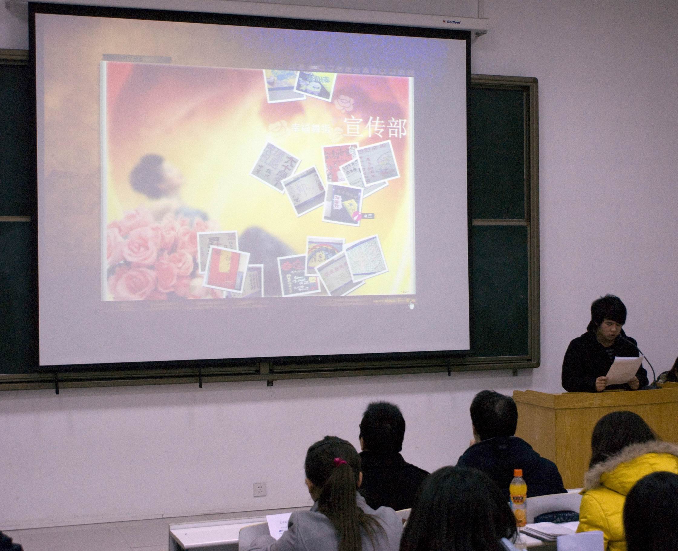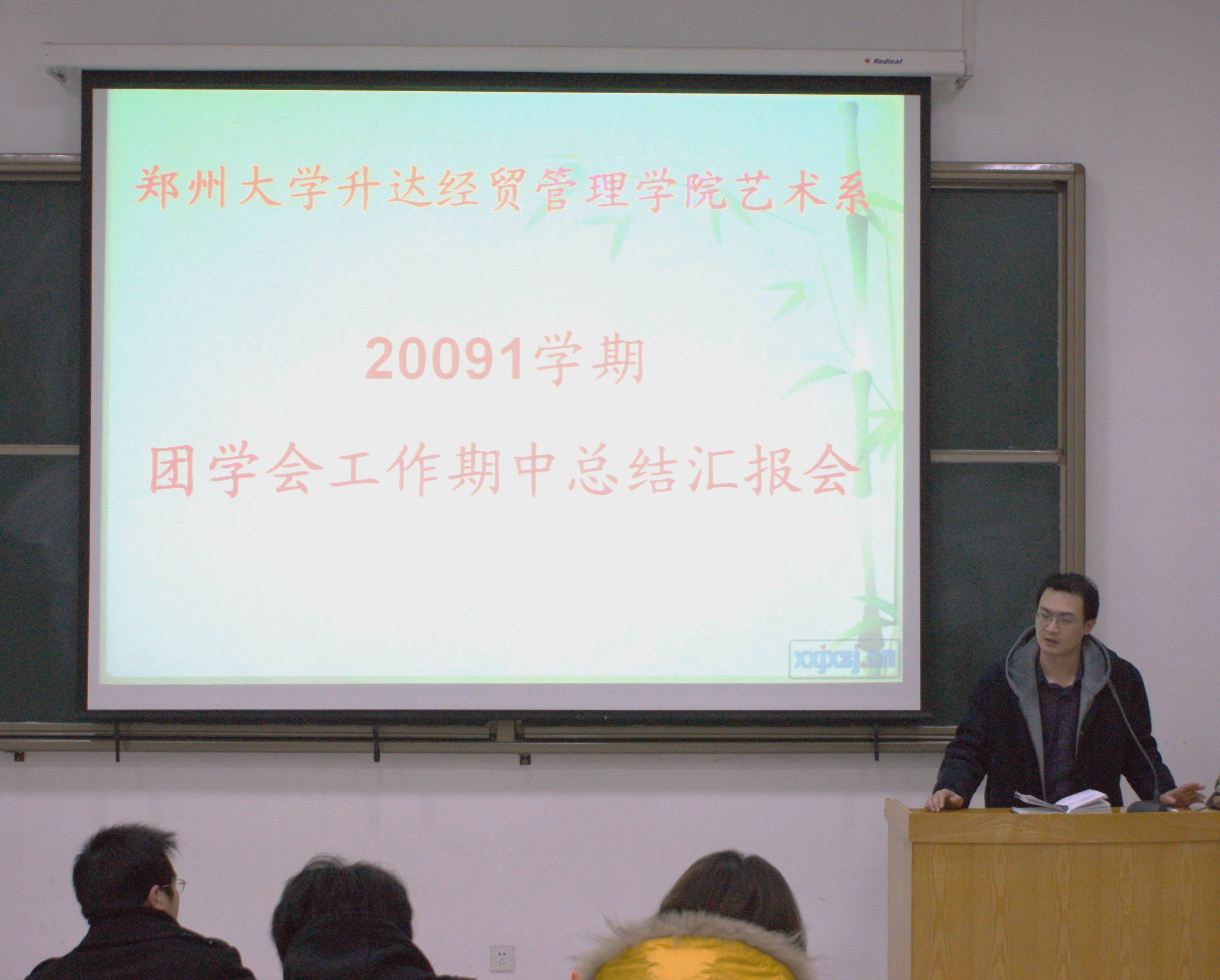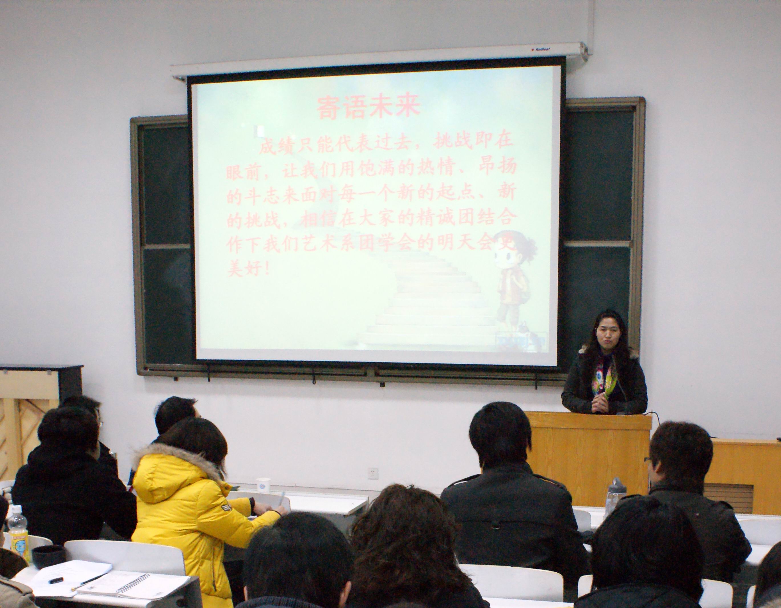 12月10日下午两点半,艺术系2009-2010学年第一学期团学会工作阶段总结大会在艺术楼104顺利召开。本次大会由系团委书记曹华莹书记主持,系党总支副书记韦杨建、系团委常务副书记邬治国老师、艺术系第二员工党支部书记赵会燕老师、辅导员老师吴晓芳、潘悦、陈坤、朱影影出席了本次会议。