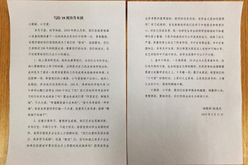 最后,张速杰老师读了《致18级视传升班的一封信》,让同学们了解到辅导员老师的三心,找到了本学期努力的方向。