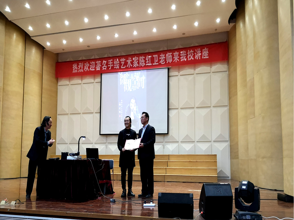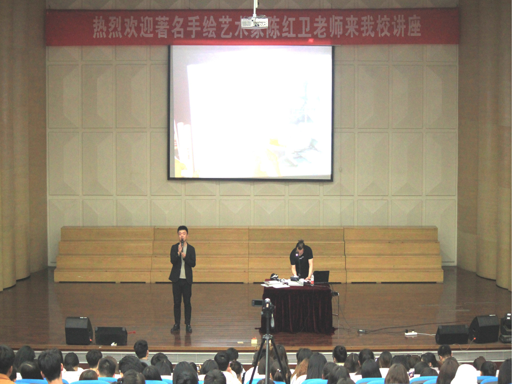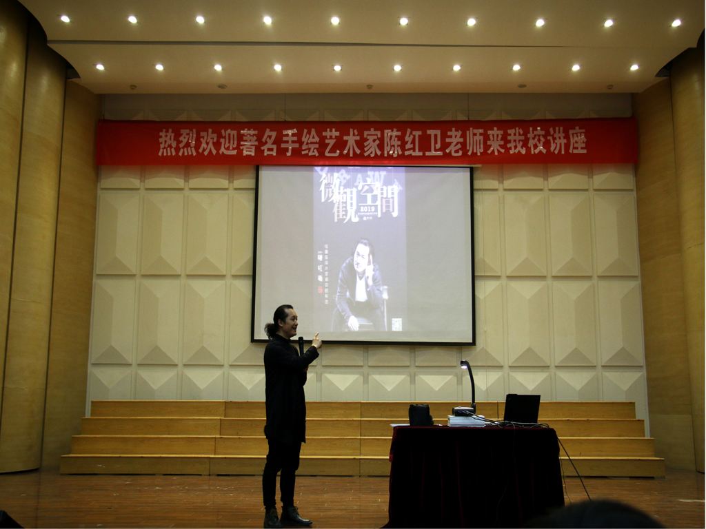 4月18日下午,经过yL23411永利集团官网的精心筹备,中国著名手绘专家陈红卫先生,于百忙之中特抽时间在艺术楼音乐厅,为全院环境设计专业师生开展主题为“微观·空间——绘画在设计空间中的形态”的学术报告。报告由yL23411永利集团官网赵维平副经理主持,公司张金安副董事长出席了活动,环境设计专业全体教师与近300多名本专业员工认真聆听了报告。