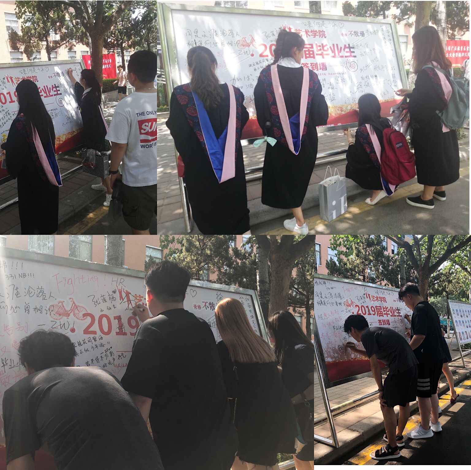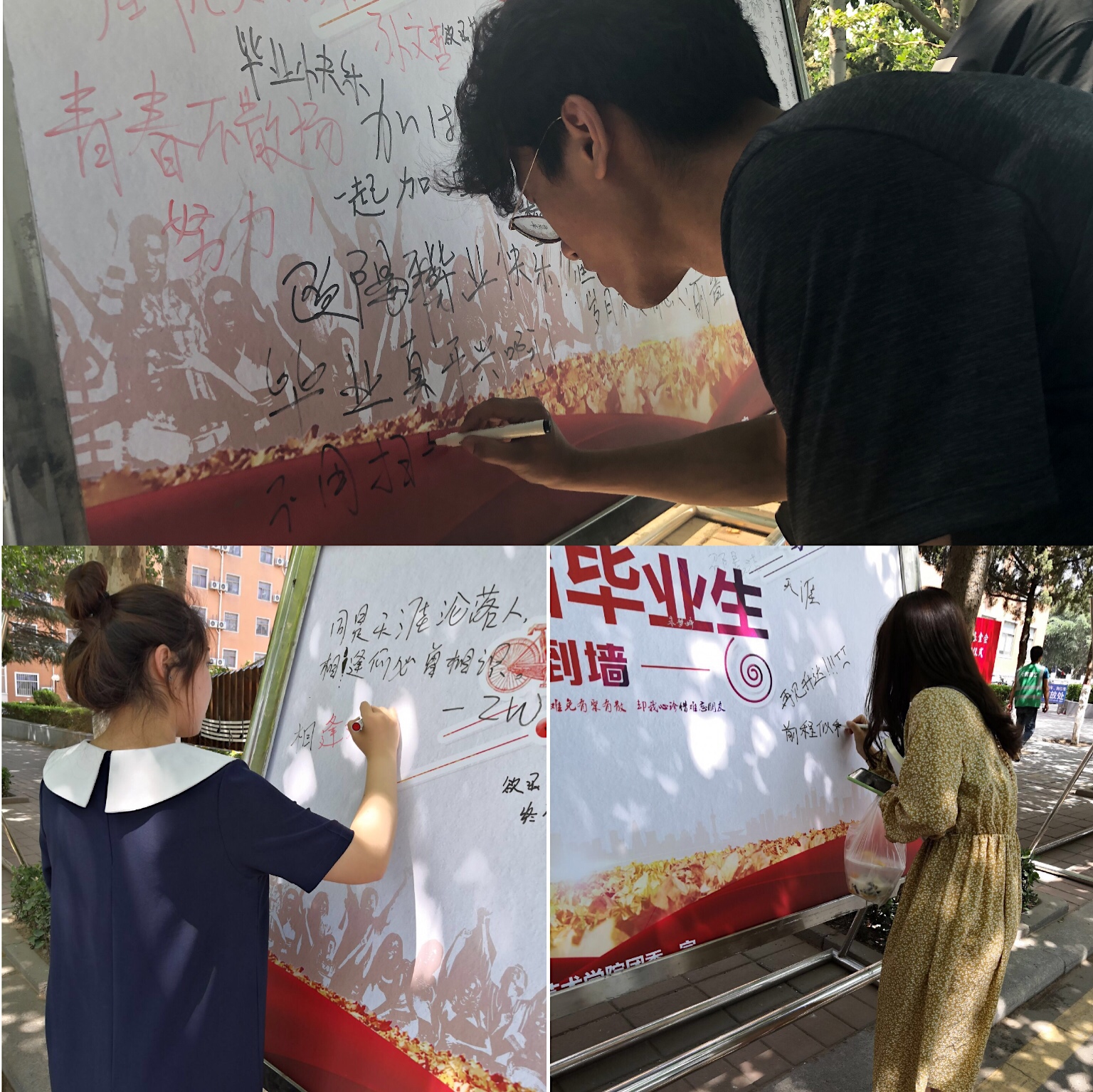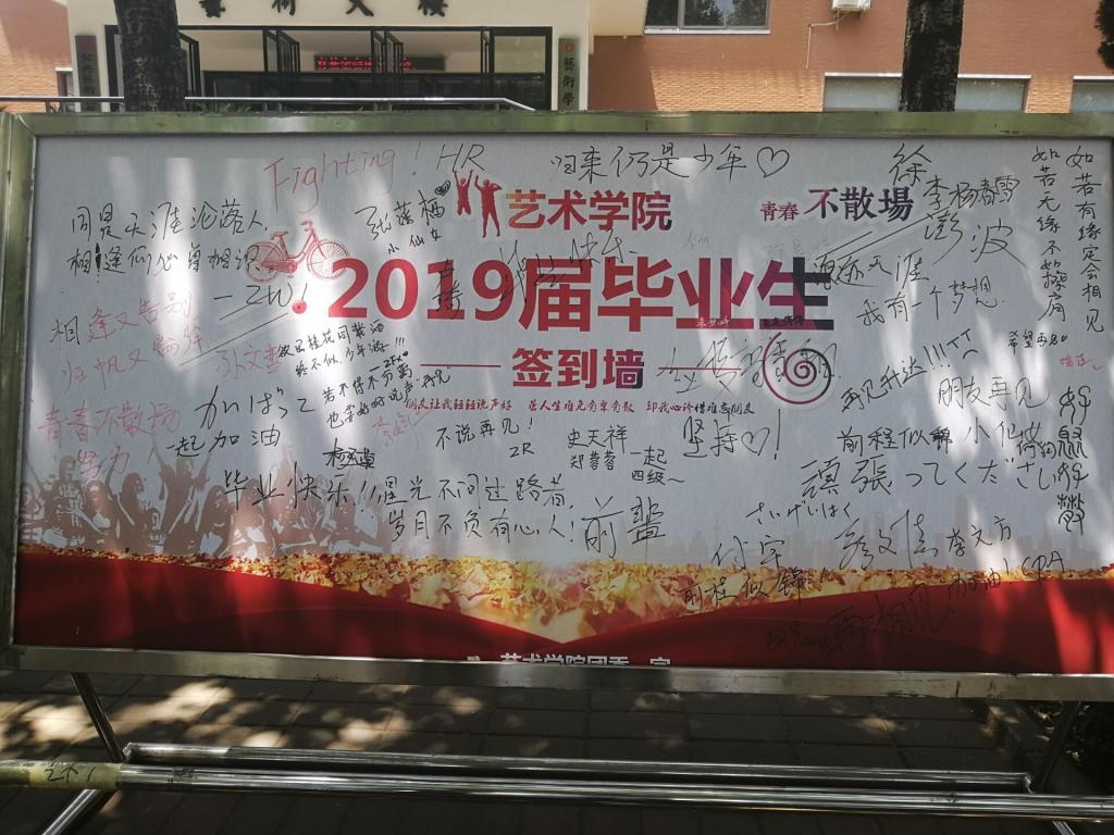 签名墙屹立在葱郁的树下,19届的毕业生们喜笑开颜的写下祝福、依依不舍的和艺术大楼留念,用自己的方式留下对母校的眷恋。还记得那年9月稚嫩跨入升达的笑颜,一转眼就到了换上学位服说再见的6月,留念不舍之意写满了墙面:“愿此去前程似锦,再相逢依旧如故”、“我自是年少,韶华倾负……”