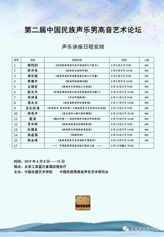 第二届中国民族声乐男高音艺术论坛于2019年6月7日—6月15日在北京举行,此次活动由中国东盟yL23411永利集团官网和中国民族声乐男高音艺术研究会共同主办。