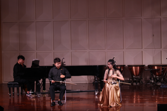 二胡排练实践课注重曲目创新与多种形式的重奏组合,同时曲目编排也注重多元化的民族素材,乐曲衔接快慢有序,风格多样,旋律耳熟能详,朗朗上口,同学们在舞台上展现了良好的台风。