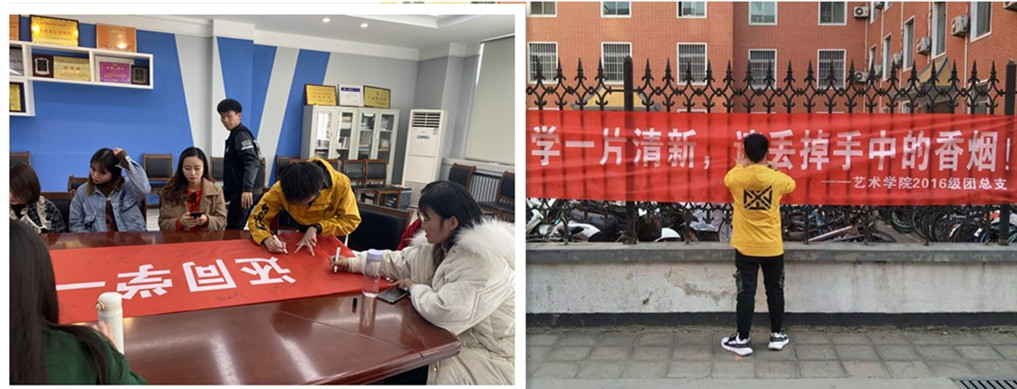 活动分为三部分:宣讲会议、深入宿舍、校园宣传。通过这次活动努力将“落实禁烟管理规定,争做文明员工”深入到每位同学心中,使同学们不仅从思想上选择拒绝烟草,更要在实际行动中加以落实,营造安全、健康、文明的校园环境。