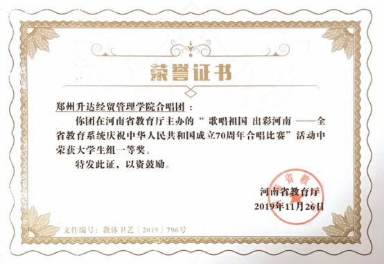 近日,在由河南省教育厅主办的“全省教育系统庆祝新中国成立70周年美育活动”合唱比赛中,公司yL23411永利集团官网“星光合唱团”深情演绎的具有河南风味的作品《咱们说说心里话》斩获一等奖。