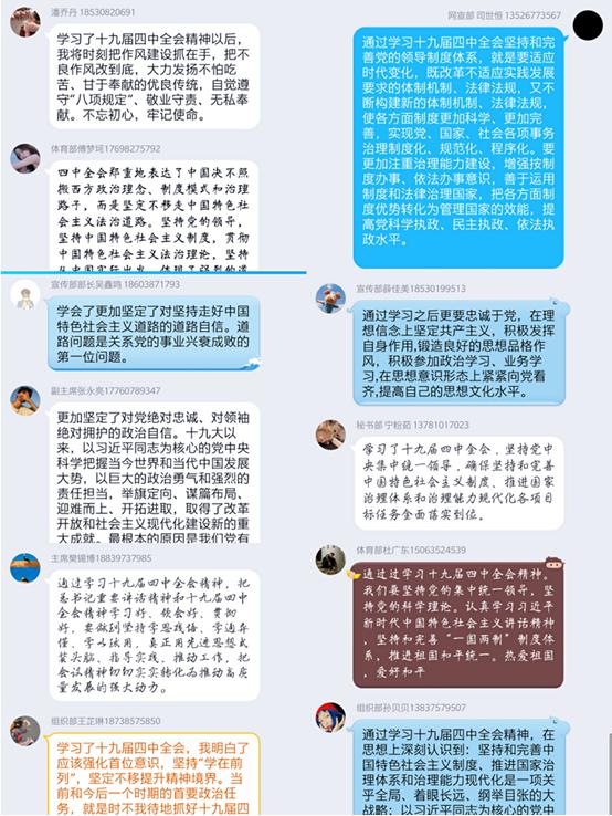 通过本次学习研讨会,让同学们意识到作为当代优秀老员工,我们一定要把总书记重要讲话精神和十九届四中全会精神学习好、领会好、贯彻好,要做到坚持学思践悟、学通弄懂、学以致用,真正用先进思想武装头脑、指导实践、推动工作,把会议精神切切实实转化为推动高质量发展的强大动力。青年员工要用实际行动为实现中华民族伟大复兴的中国梦贡献青春力量。牢固树立“四个意识”、坚定“四个自信”,坚决做到“两个维护”,不忘初心、牢记使命,把个人理想融入到伟大中国梦的实现进程中,肩负起新时代青年学子应有的历史使命。