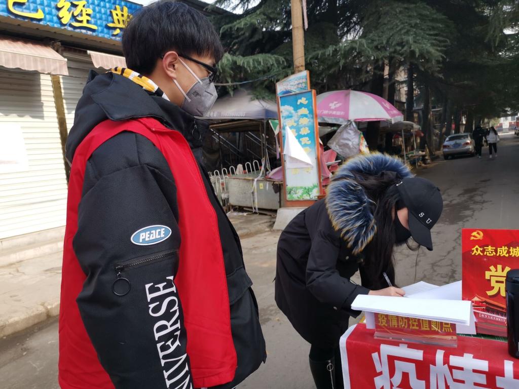 自农历腊月二十八开始,公司李晓珂同学就主动参加焦作沁阳市合作街社区防治新冠病毒志愿者活动。在工作中,李晓珂同学佩戴红袖章,与社区工作人员在街道巡逻,在辖区内开展一系列防范宣传活动。在街道路口进行排查,登记人员出入情况,协助社区工作人员发放宣传页,对社区进行消毒,为往来居民测量体温,引导居民做好防护工作。