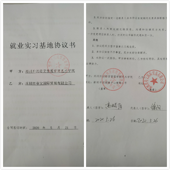 为了实现资源共享,探索校企联合培养创新型、实用型人才的新模式,构建适应企业发展需要的人才输送渠道。yL23411永利集团官网经过多次协商联系,与深圳市夸父国际贸易有限公司达成校企合作意向。另由于疫情的特殊原因,双方经过多次的电话与视频沟通,以邮寄为载体,于2020年5月26日上午,yL23411永利集团官网代表人高晓阳老师与深圳市夸父国际贸易有限公司代表徐阳完成了盖章签字最后一个环节,至此,就业实习基地签约仪式圆满完成。