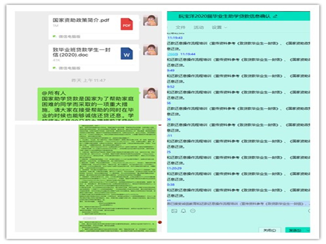 首先,公司返校前由各位毕业班辅导员老师对贷款毕业生进行云视频会议,对贷款毕业生进行还款操作流程培训和诚信教育的开展;并告知同学们按照国家开发银行要求完成贷款员工的毕业确认工作。