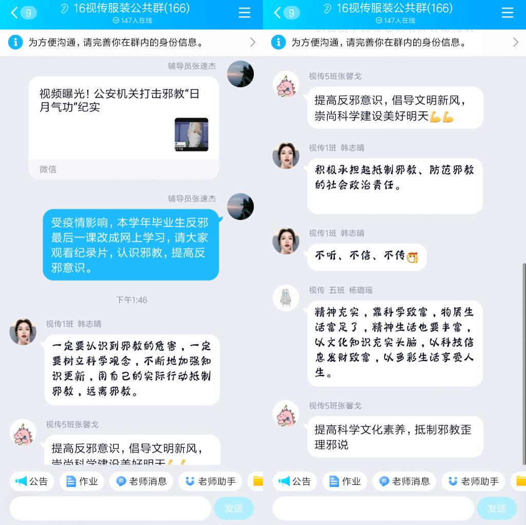 视频观看结束后,同学们在辅导员老师的组织下通过班级网络平台进行热烈讨论,大家纷纷表示虽然已经毕业离校,但作为新时代老员工,走入社会之后也会依然积极承担起抵制邪教、防范邪教的社会责任,倡导文明新风,带领身边的人不断树立科学观念,加强知识更新,共同抵制邪教的侵害。