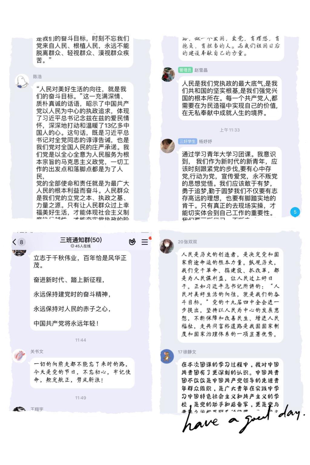 各班团支书带领全体团员从学习习近平总书记给复旦大学《共产党宣言》展示馆党员志愿服务队全体队员回信精神入手,学习了习近平总书记系列讲话精神、习近平总书记视察河南重要讲话精神。并在班级群中进行了认真细致的讨论。