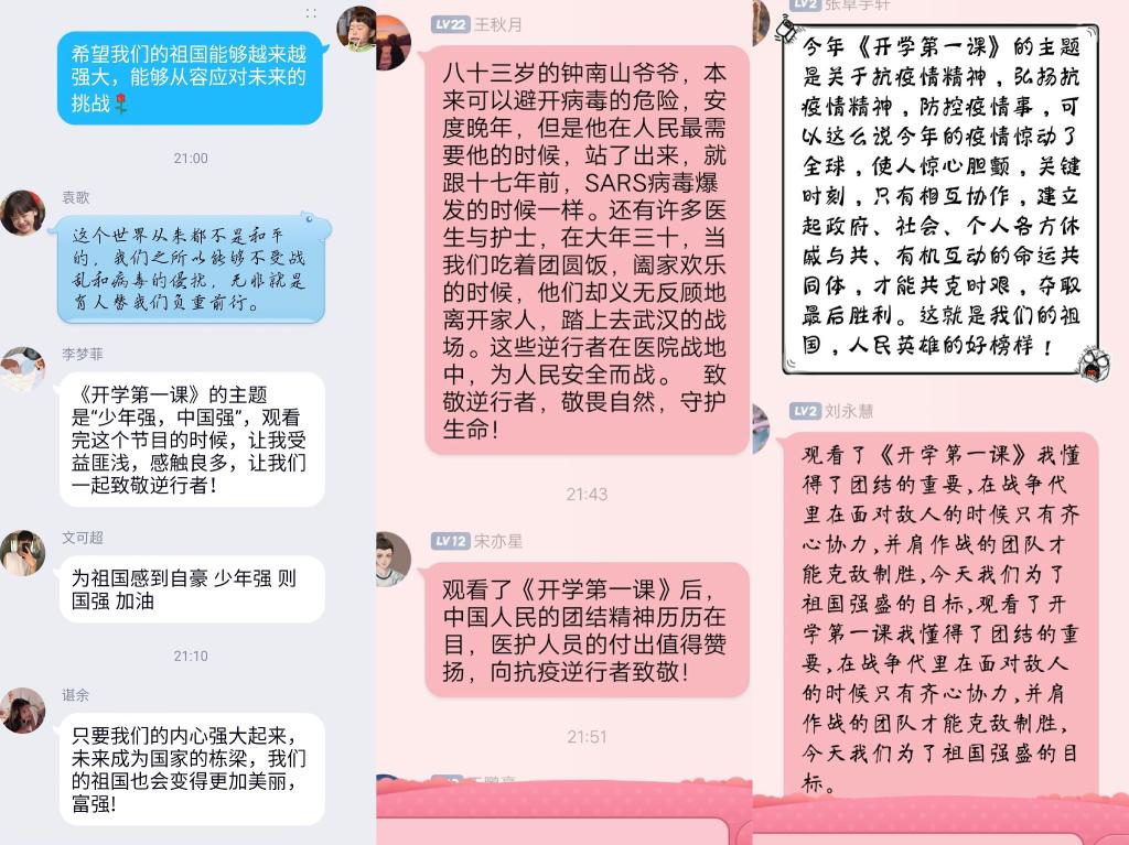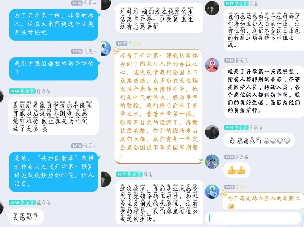 18级音本一班员工闫晓宇说,观看了《开学第一课》,我切实体会到了国家对人民的赤诚之心,这次疫情我们全国上下众志成城,众多白衣天使豁出性命与疫情作斗争,他们是平凡的伟大,经历半年的防控,我们终于迎来了开学之日,看着节目,我的眼睛不禁湿润了,感谢抗疫英雄,我们青年一代定当发奋图强不辜负祖国的期望。