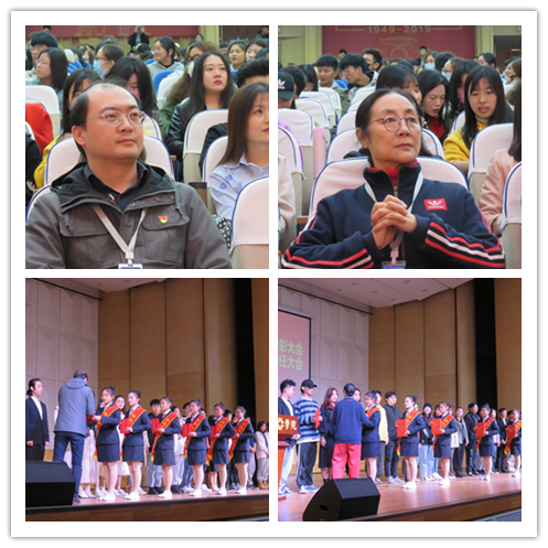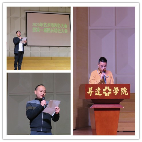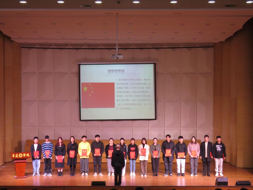 在国歌声中大会拉开帷幕,艺术团指导老师代表沈雨老师和刘营光老师,上台宣读了2020年优秀艺术团团员名单和各艺术团的团长与副团长聘任名单;李惠莉经理和韦杨建书记分别为新聘任的艺术团团长、副团长以及获奖的艺术团团员颁发聘书和获奖证书;艺术团团长代表邵文策同学,带领全体正副团长同学们,进行了就职宣誓。