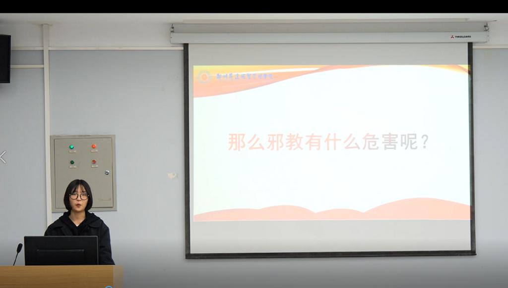 参加本次微课活动的同学有19音乐表演的李怡菲、余光华、陈烨、张祥祥、赵纹新等同学,主要利用PPT课件列举众多典型案例,讲解了什么是邪教,邪教侵害群众身心健康和生命安全,邪教的传播途径,最终教育同学们识别邪教与反对邪教。