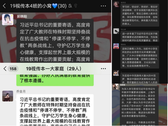 19视传本1班的乔金月同学说,“习近平总书记的重要寄语,高度肯定了广大教师在特殊时期坚持奋战在抗击疫情和“停课不停学、不停教”两条战线上,守护亿万员工身心健康,支撑起世界上最大规模的在线教育作出的重要贡献;高度肯定了广大教师在决胜全面建成小康社会、决战脱贫攻坚中,用爱心和智慧阻断贫困代际传递,点亮万千孩子的人生梦想。”