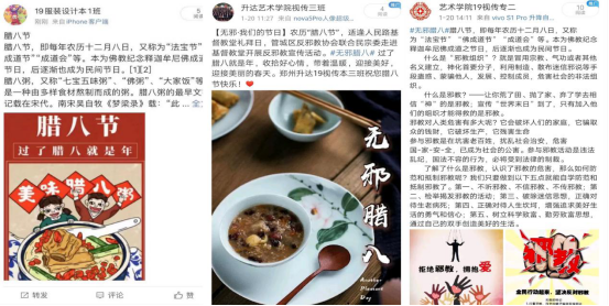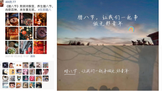 本次宣传活动以线上宣传为主,各班同学搜集关于“腊八节”的风俗图片,结合传统节日的相关知识,分别通过班级微博、公众号进行宣传,向广大网友科普“腊八节”的来历及民间传说。同时,各班级还在班级群中进行了讨论,每个地方的“腊八节”有哪些不一样的腊八美食,每家每户的腊八粥中都有哪些食材,不同地区的腊八节有哪些传统活动等。