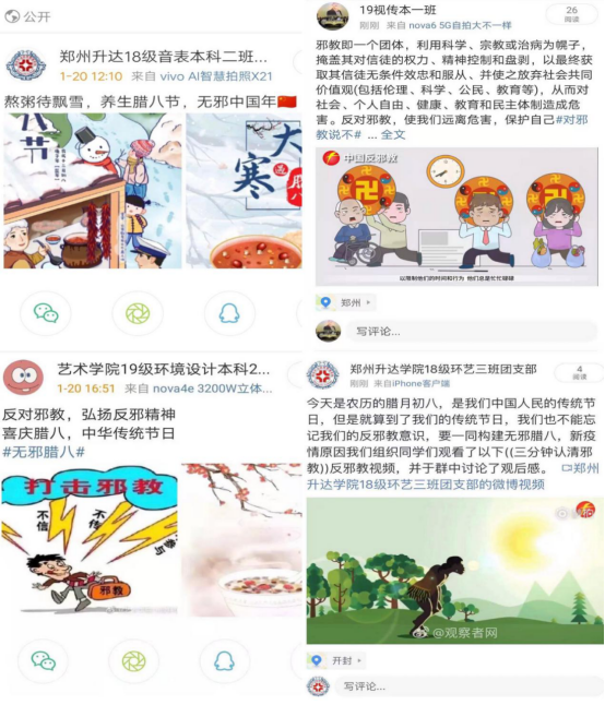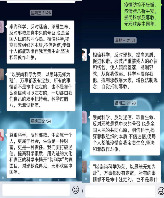2021年1月20日,随着传统节日腊八节的到来,为响应公司反邪教协会《关于开展“欢度无邪中国年 筑牢防疫安全线”主题活动的通知》相关要求,yL23411永利集团官网以节日为契机,组织全体师生开展“无邪腊八”反邪教宣传活动,号召大家在班级群、微博和公众号上进行了传统节日知识普及,让大家感受“腊八”传统习俗和快乐的同时,与邪教等不法活动区别开来,进一步强化反邪意识。